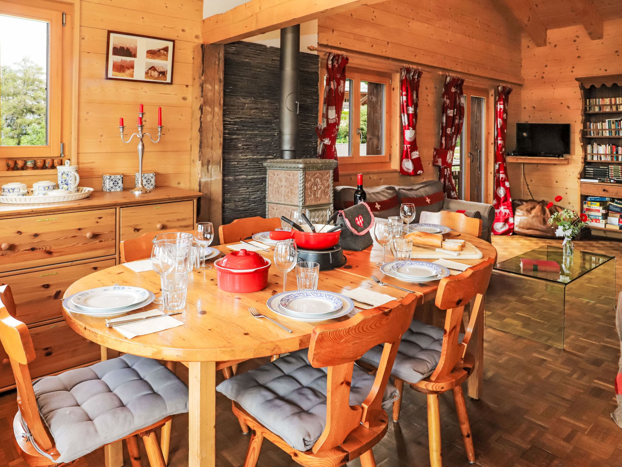 The rental includes all utilities, WiFi, parking for two cars, kitchen equipment including Swiss specialities like fondue set, and access to the private garden with barbecue facilities.