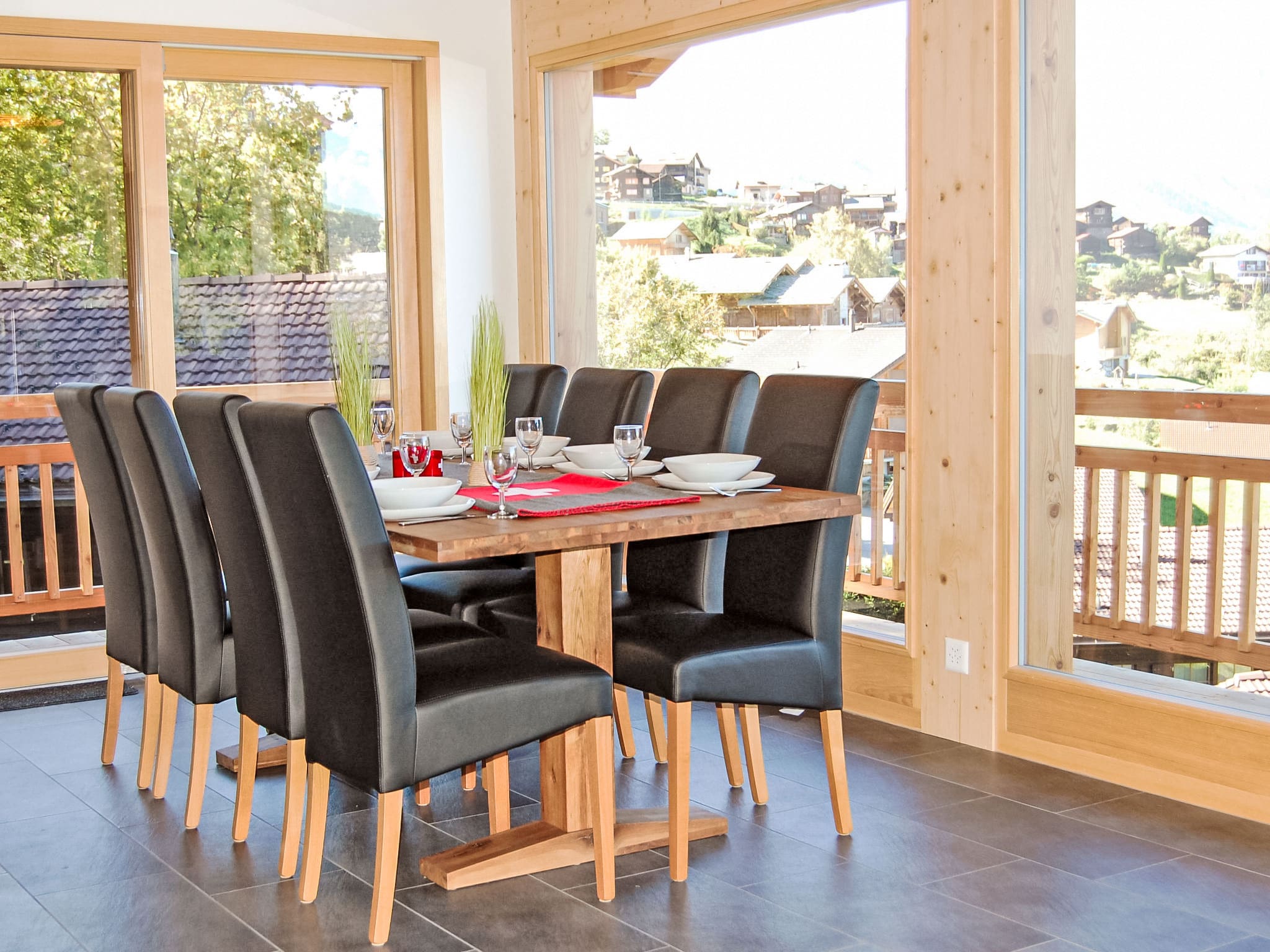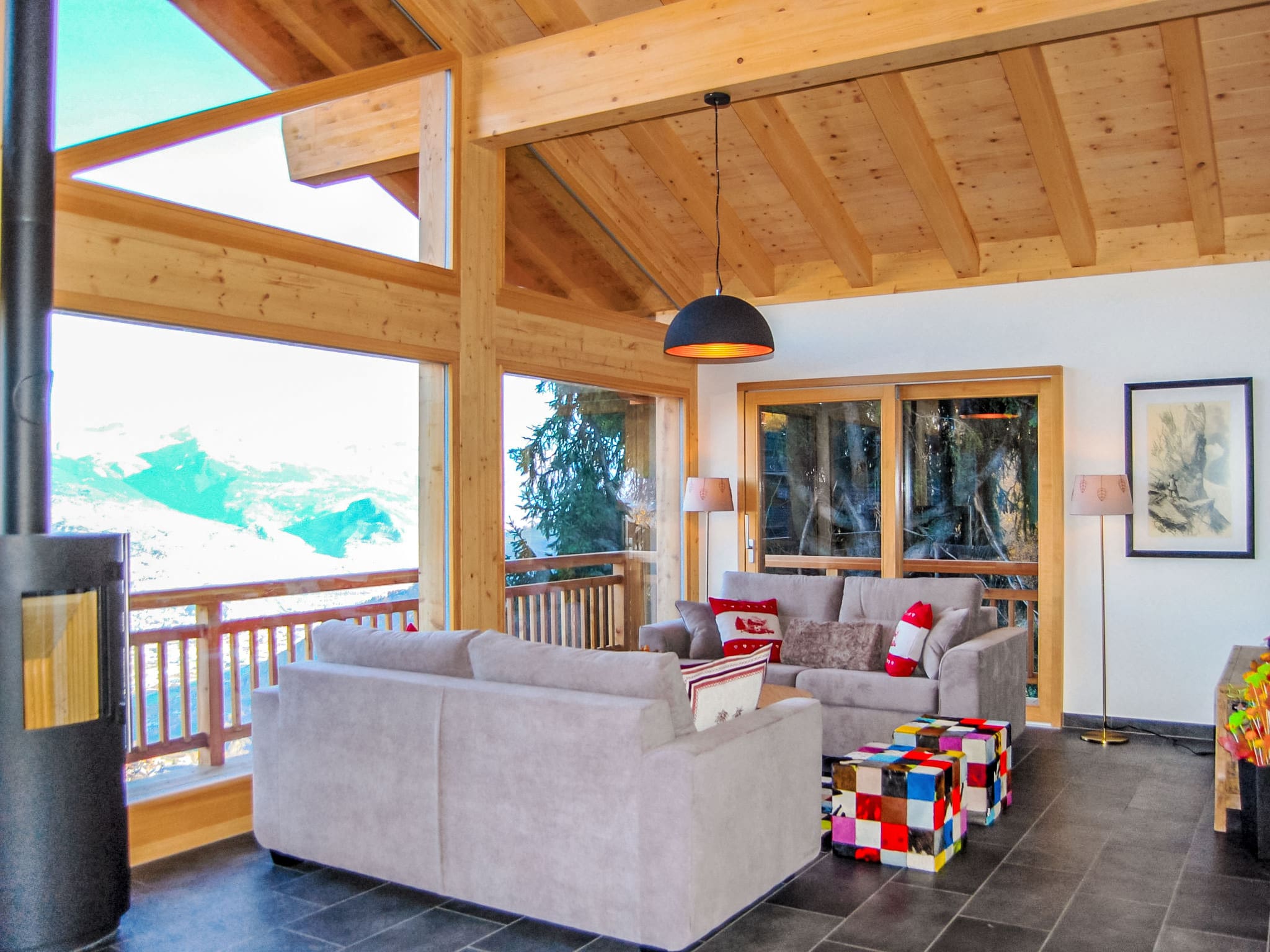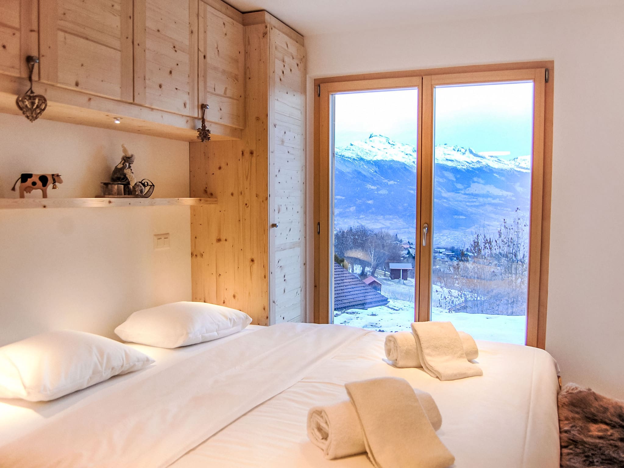 Spanning 155 square metres across two levels, this beautiful chalet accommodates up to eight guests in thoughtfully designed spaces. The open-plan living area features a panoramic window that frames breathtaking mountain and valley views, while a Scandinavian wood stove creates a cosy atmosphere after days on the slopes. The modern kitchen comes fully equipped with induction hobs, dishwasher, microwave, and even includes raclette and fondue sets for authentic Swiss dining experiences. Two comfortable double bedrooms provide peaceful retreats, while a dedicated children’s room with bunk beds makes this ideal for families. The property also features a private sauna, perfect for relaxing after active mountain days.
