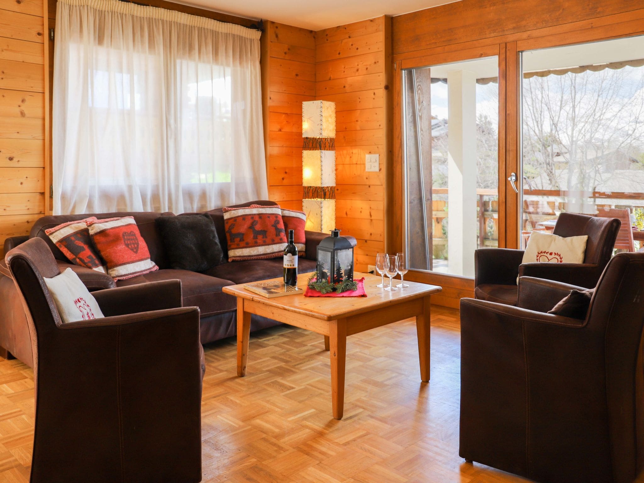 Multiple balconies extend the living space outdoors, offering various exposures to capture mountain views throughout the day. The large north and west-facing balconies provide furnished outdoor areas where guests can savour morning coffee while planning Alpine adventures or enjoy evening aperitifs as the sun sets behind the peaks. The elevated position ensures unobstructed vistas of the surrounding countryside and dramatic mountain panorama that defines this exceptional location.