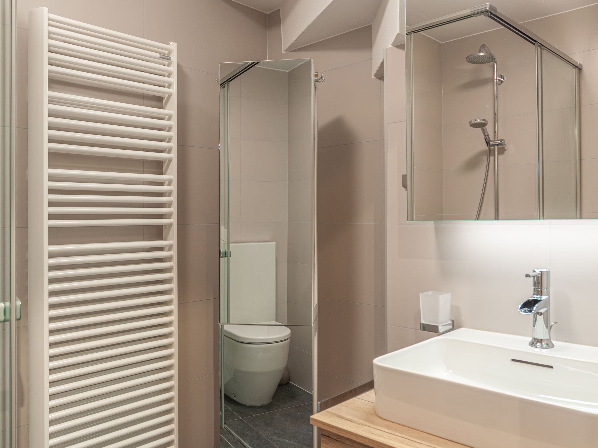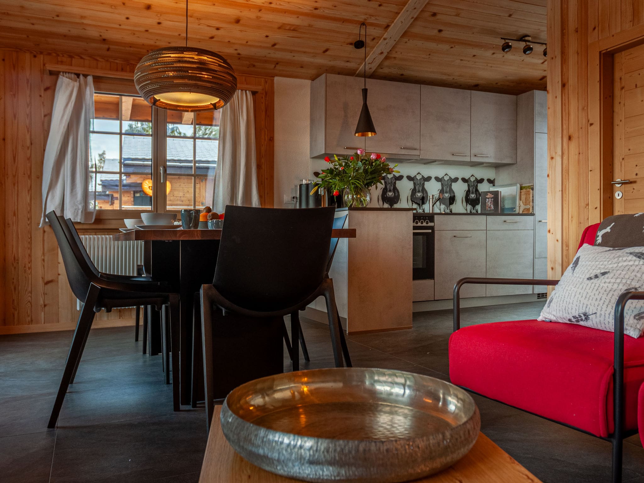 Spanning 80 square metres across two carefully designed levels, this three-bedroom chalet accommodates up to six guests in sophisticated comfort. The heart of the home features a welcoming living and dining area centred around an open-hearth fireplace, creating the perfect gathering space after days exploring the mountains. The modern open kitchen comes fully equipped with premium appliances including an oven, dishwasher, ceramic hob, and Nespresso coffee machine, plus authentic Swiss touches like raclette grill and fondue sets for memorable evenings.