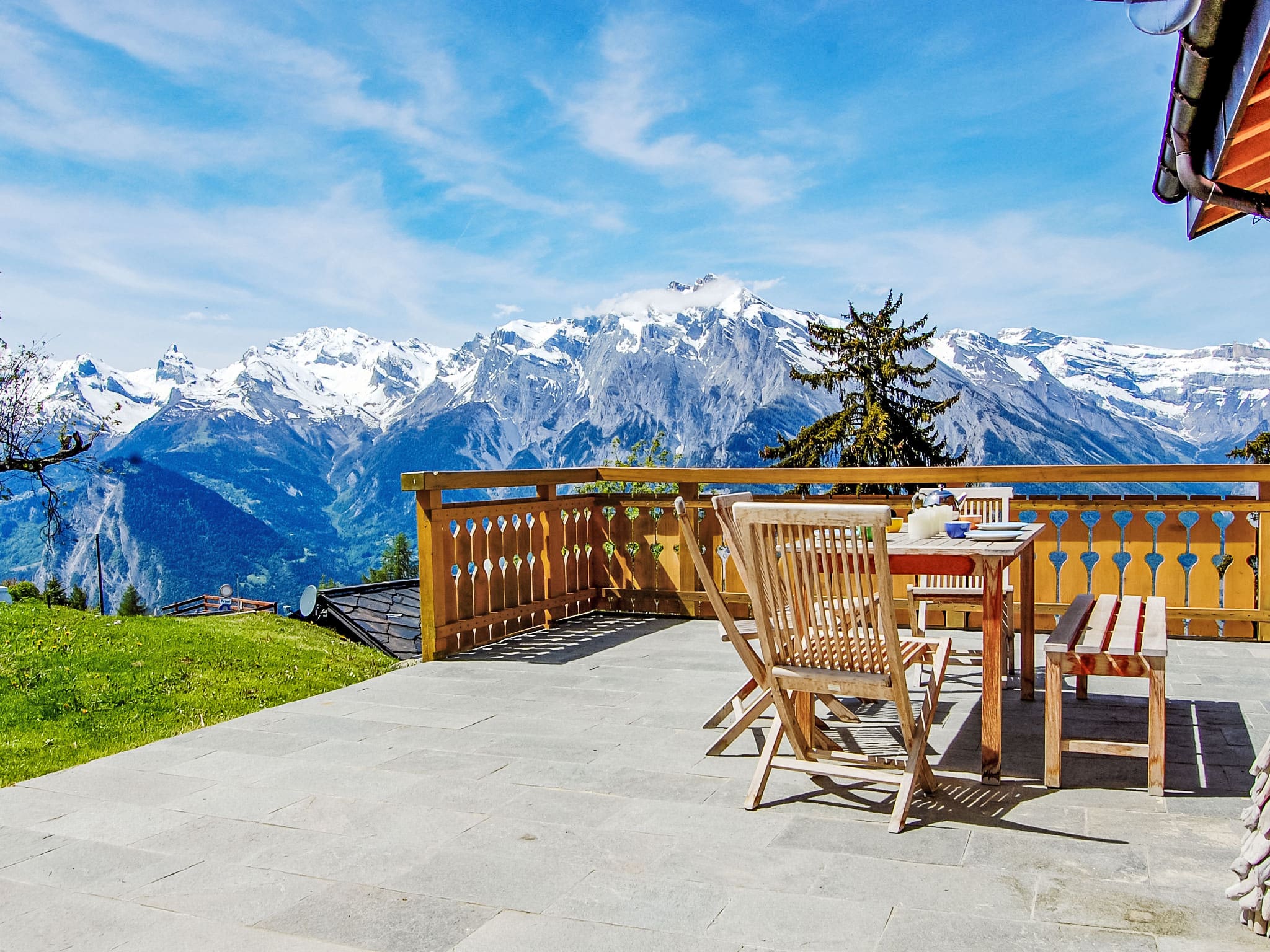 The chalet’s outdoor spaces take full advantage of its elevated position with spectacular mountain and valley views. Multiple terraces and balconies face different directions, maximising sun exposure throughout the day. The west-facing terrace provides the perfect setting for sunset aperitifs, while the large north-facing balcony offers dramatic mountain vistas. The private garden with lawn creates a peaceful retreat during warmer months, complete with barbecue facilities and comfortable outdoor furniture. Deck chairs invite relaxation while soaking in the pristine Alpine air.