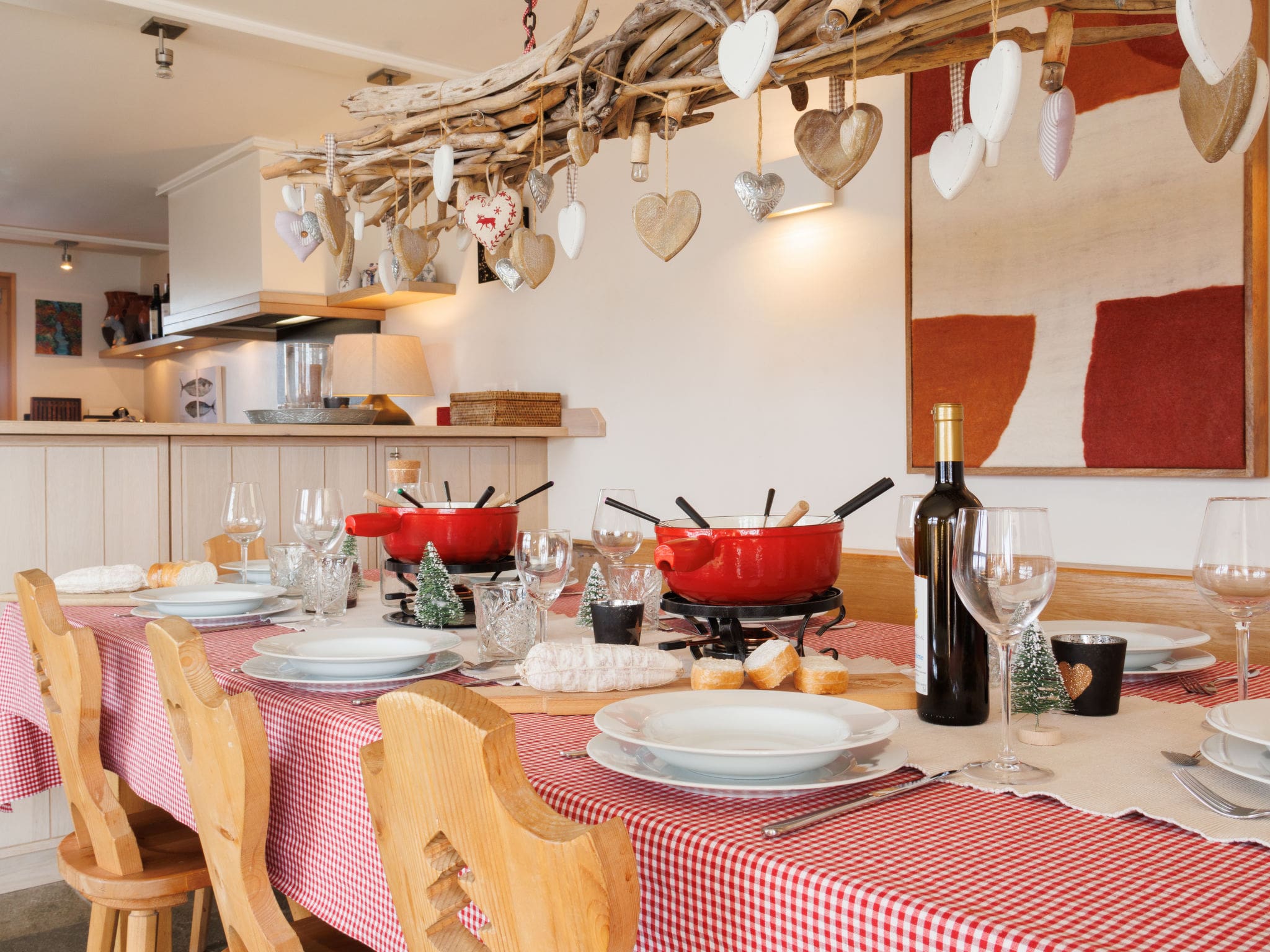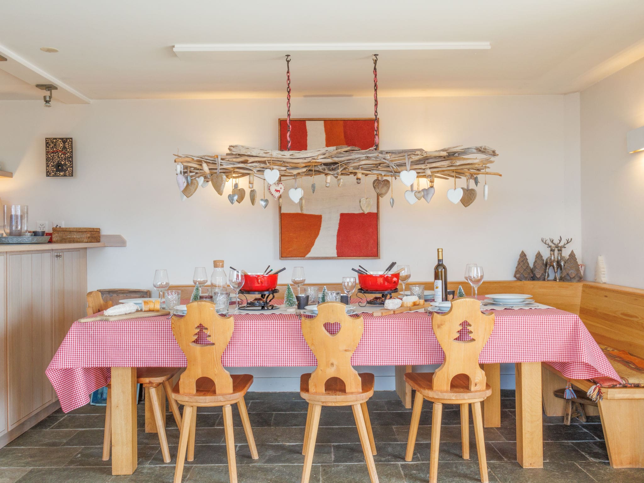 Built in 2007, this modern chalet showcases 210 square metres of sophisticated living space designed for comfort and elegance. The heart of the home features an open-plan living and dining area with a striking open-hearth fireplace, perfect for gathering after days on the slopes. Natural stone floors throughout create a sense of luxury while maintaining the authentic Alpine atmosphere. The open kitchen comes fully equipped with premium appliances including a five-plate ceramic hob, dishwasher, microwave, and Nespresso coffee machine. Traditional Swiss touches include a raclette grill and fondue set for memorable evenings.