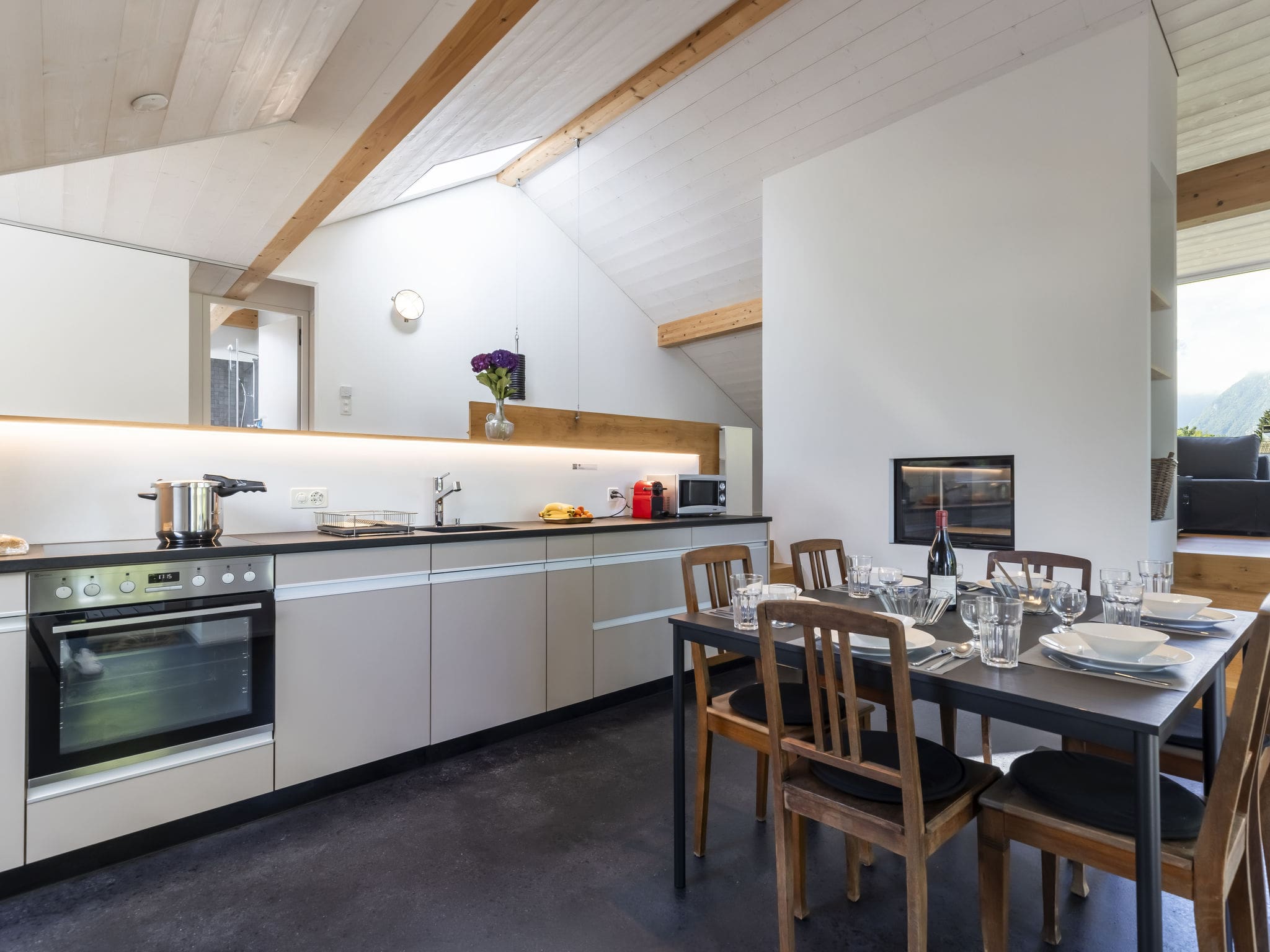 The chalet features two complete living and dining areas, each with its own fully equipped kitchen, providing exceptional flexibility for families or groups. The upper level showcases an impressive open-hearth fireplace that serves as a focal point for cozy evenings, while both levels offer seamless indoor-outdoor living through direct access to outdoor spaces. Modern amenities include dual dishwashers, ceramic glass hob hotplates, microwaves, Nespresso coffee machines, and specialized Alpine cooking equipment including raclette grills and fondue sets.