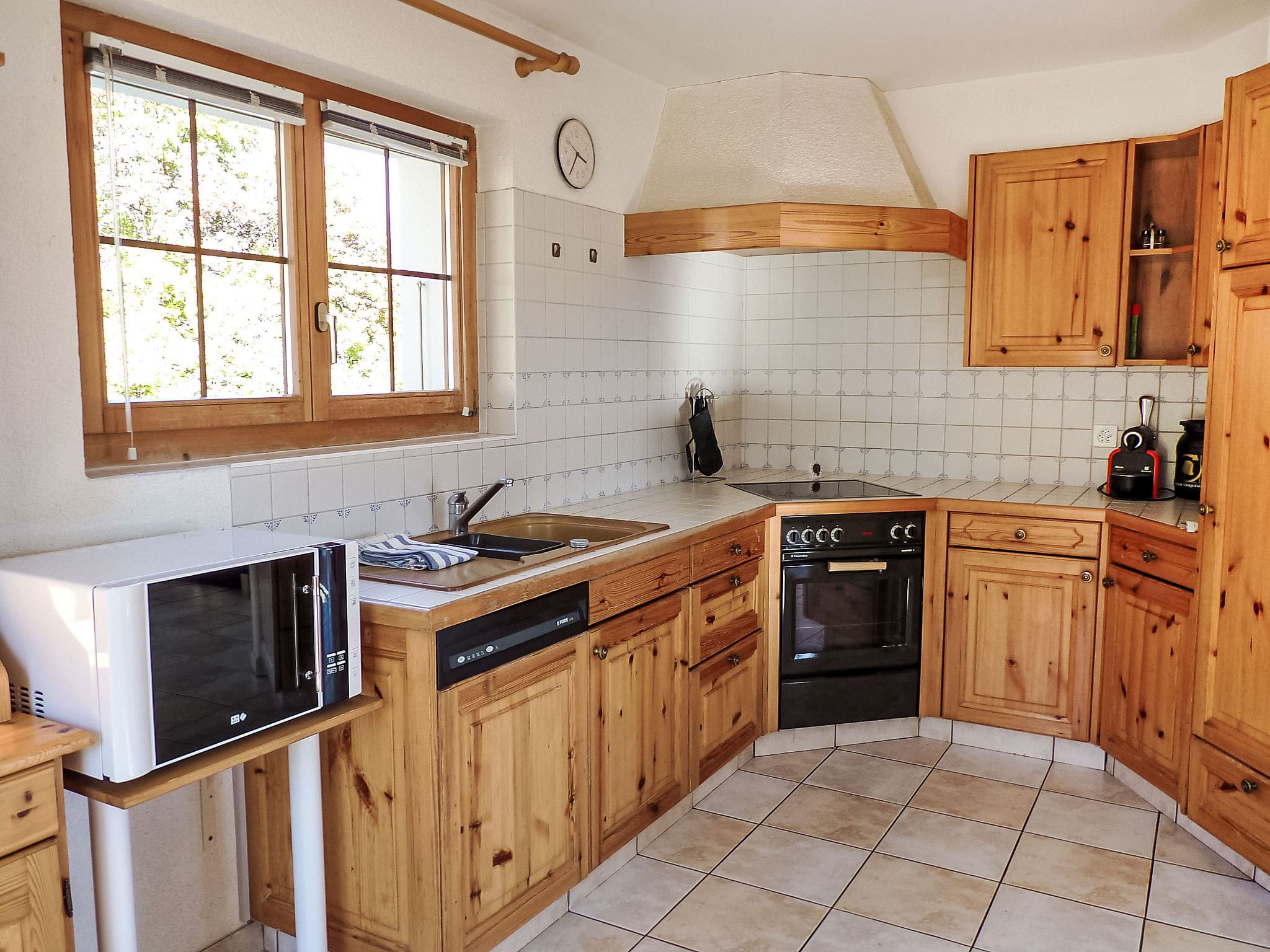 The fully equipped kitchen includes modern conveniences alongside traditional Swiss cooking essentials, from a raclette grill to a fondue set for authentic alpine dining experiences. A Nespresso coffee machine ensures perfect morning coffee, while the dishwasher and microwave add practical convenience for larger groups.