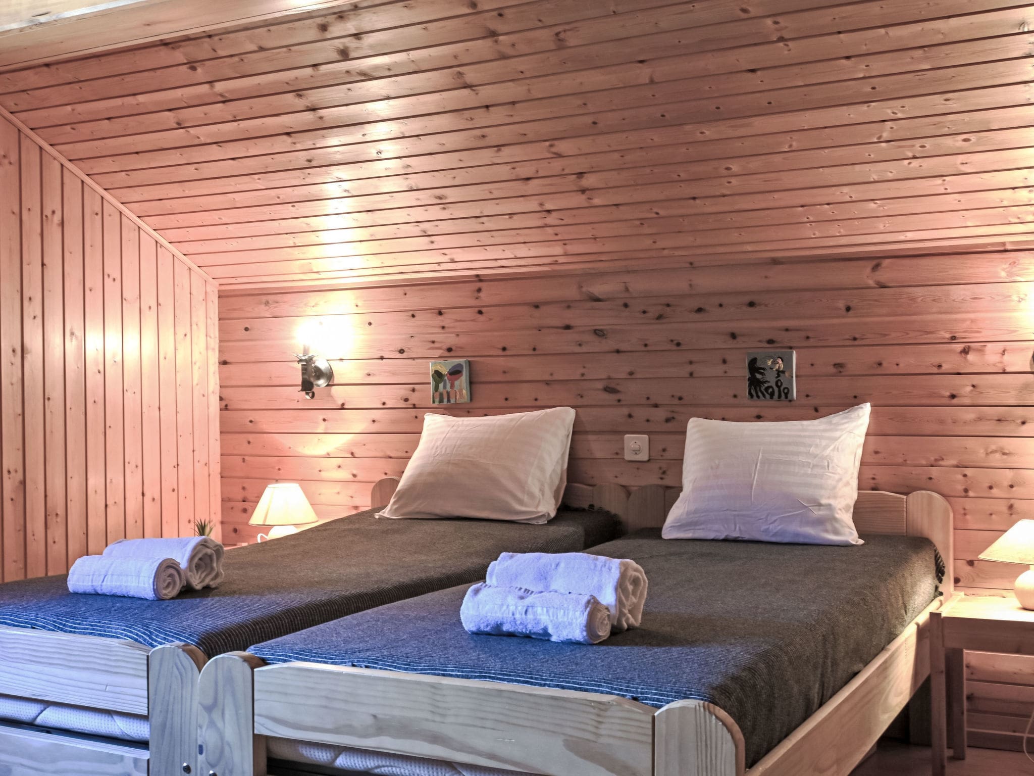 Upstairs, three thoughtfully arranged bedrooms provide comfortable accommodation for up to six guests. Each room features twin beds with quality linens, while large windows frame stunning mountain views that serve as natural artwork. The property includes both a ground-floor shower room and an upper-level bathroom with bathtub, ensuring convenience for all guests.
