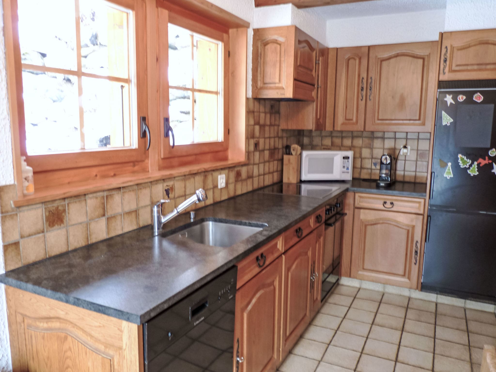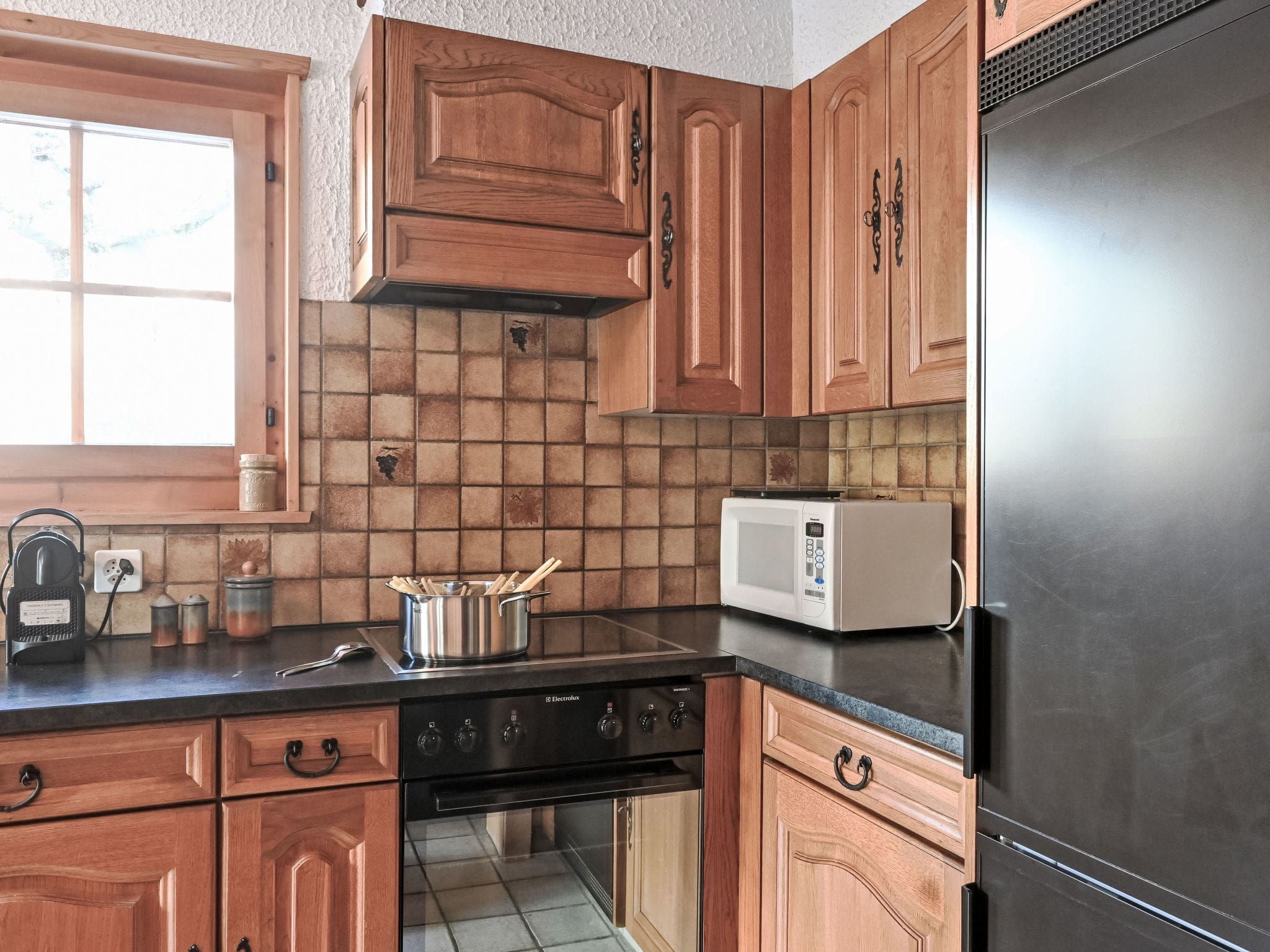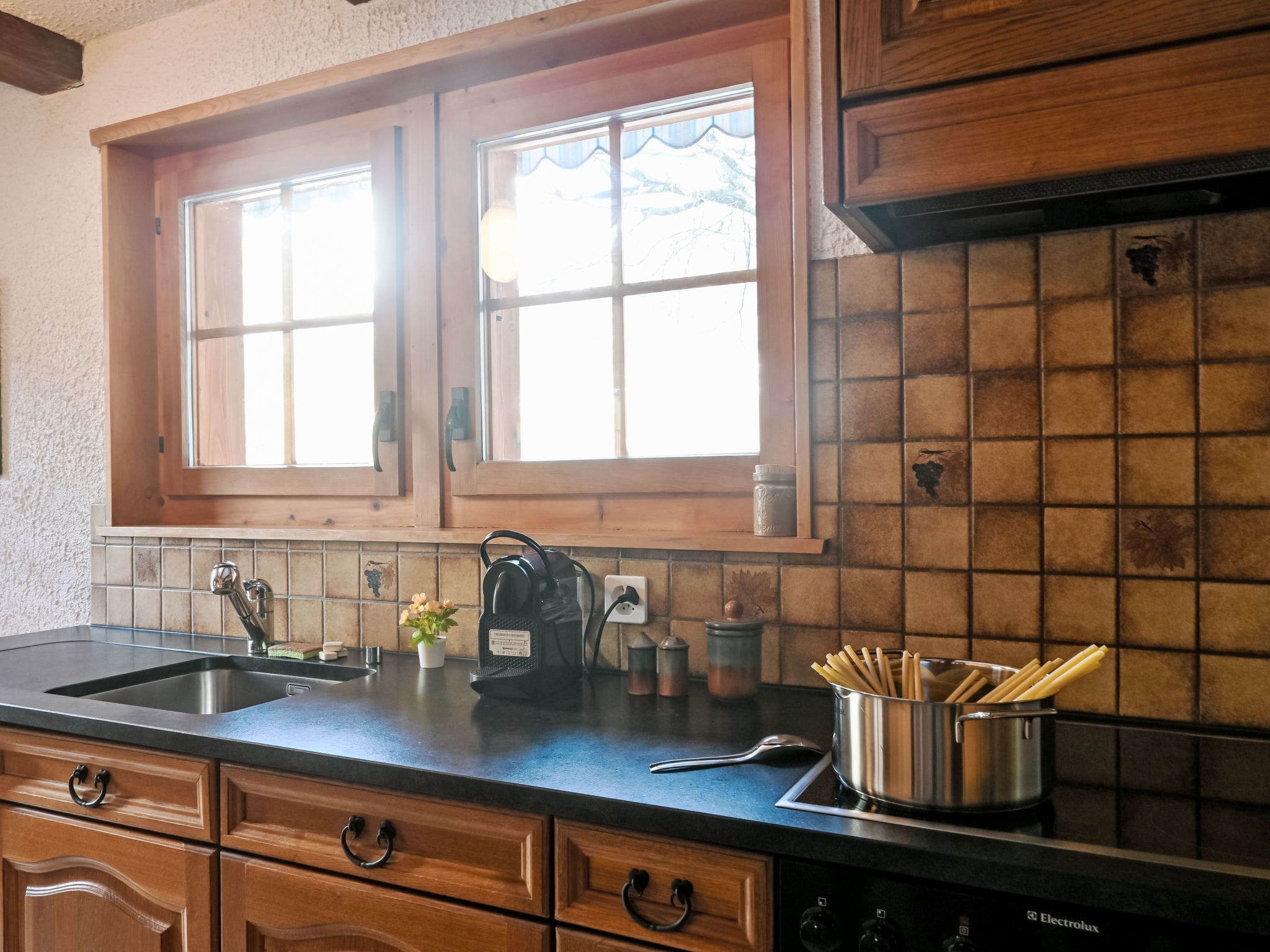 The well-equipped kitchenette includes modern conveniences including a four-plate cooktop, oven, dishwasher, and microwave, making it effortless to prepare meals using local Alpine ingredients. Direct access to the garden from the main living area creates a seamless indoor-outdoor flow that epitomizes relaxed mountain living.