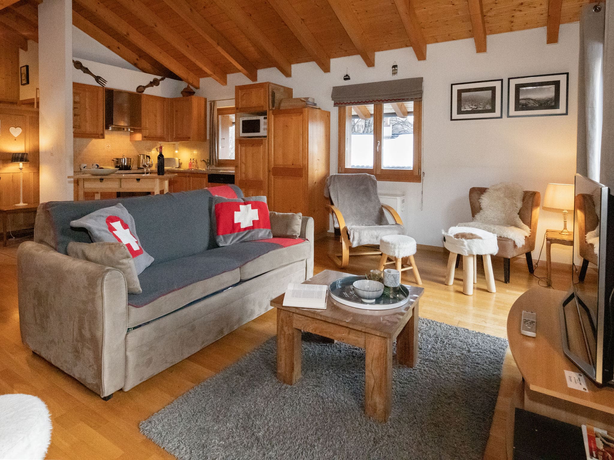 Spread across two carefully designed levels, this 150-square-metre chalet welcomes guests into a spacious living area anchored by a traditional open-hearth fireplace. The heart of the home flows seamlessly from the comfortable seating area to the dining space, where large windows frame spectacular mountain vistas. The fully equipped kitchen features modern appliances including a dishwasher, microwave, and ceramic hob, alongside quintessentially Swiss touches like a raclette grill and fondue set for authentic Alpine dining experiences.