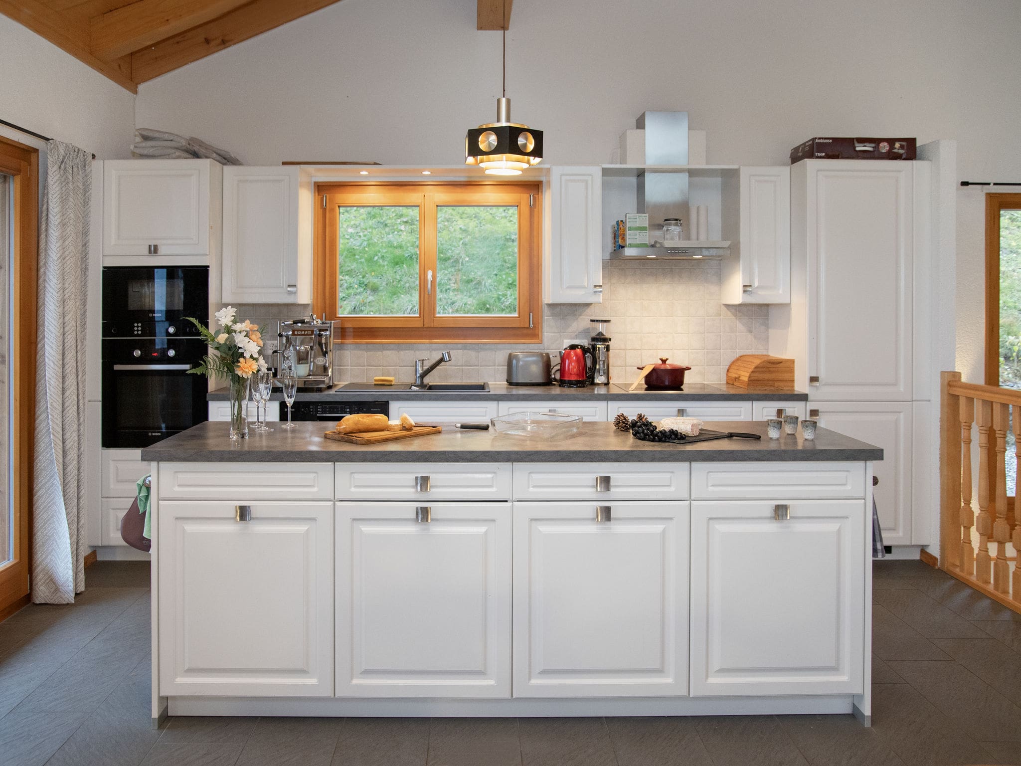 The chalet’s sophisticated interior design celebrates both comfort and Alpine elegance across two thoughtfully planned levels. The heart of the property features a magnificent open-plan living and dining area crowned by panoramic windows that frame spectacular mountain vistas. A beautiful Scandinavian wood stove creates a cosy focal point, while the seamless integration with outdoor terraces extends the living space into the pristine mountain environment. The contemporary open kitchen showcases premium appliances including dishwasher, microwave, and electric coffee machine, complemented by traditional Alpine touches such as raclette grill and fondue sets for authentic Swiss dining experiences.