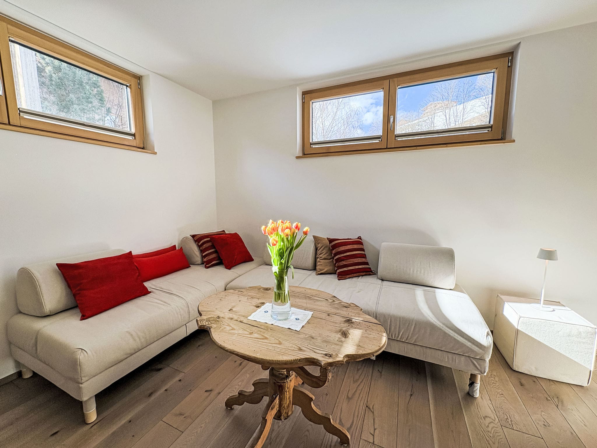 The bright and tastefully appointed 53-square-metre apartment showcases beautiful country house style furnishings throughout its thoughtfully designed living spaces. The generous open-plan living and dining area centres around a comfortable sofa bed, while floor-to-ceiling windows frame spectacular views of the surrounding peaks. The large double bedroom provides a peaceful retreat after exhilarating days on the mountains, while the fully equipped kitchen features premium appliances including a dishwasher, ceramic glass hob, and Tschibo Cafissimo coffee machine for perfect morning brews.