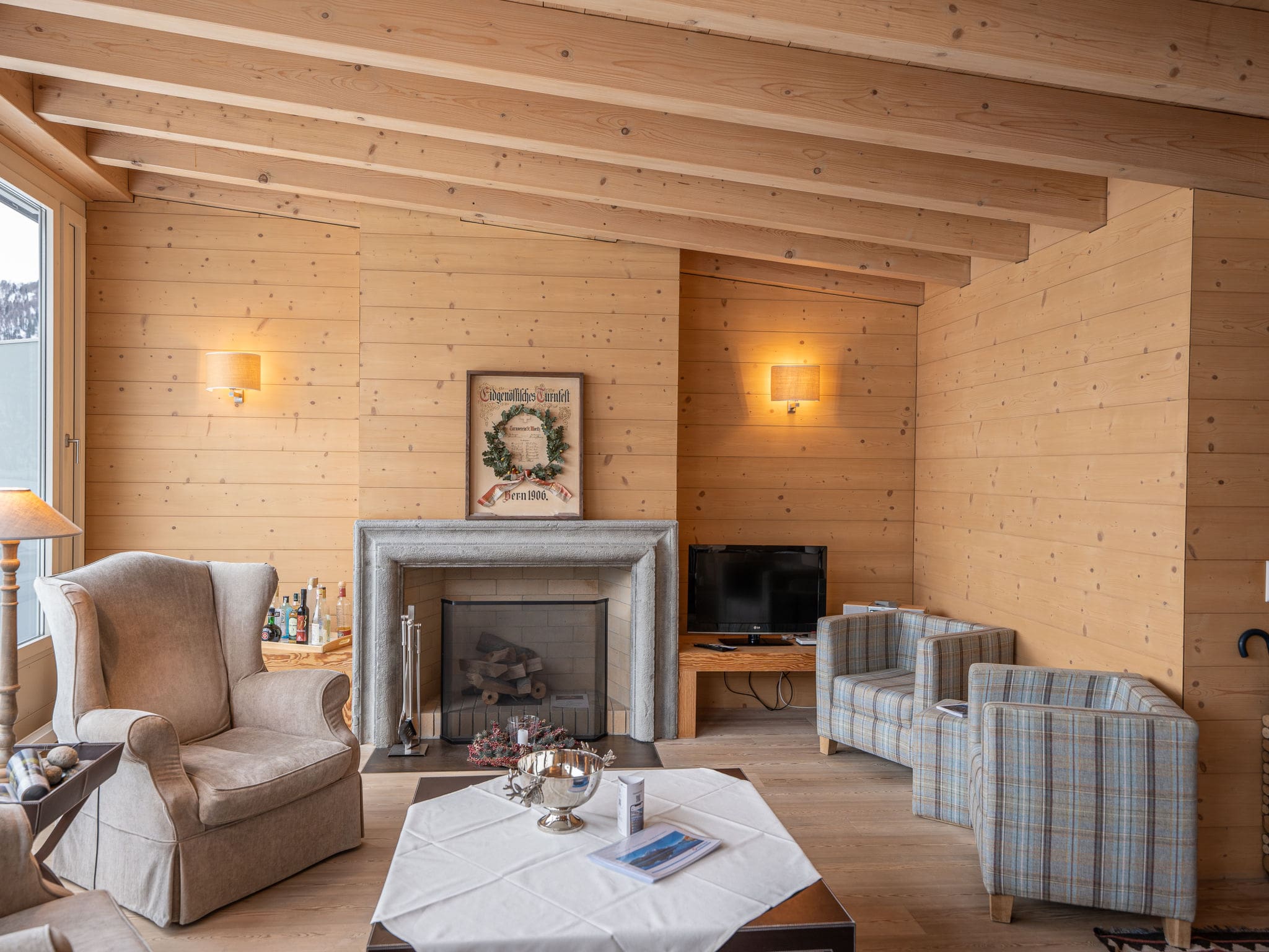 The apartment’s contemporary design maximises both space and natural light, creating an atmosphere of understated luxury throughout. The open-plan living area centres around a decorative fireplace and flows seamlessly into a fully equipped kitchen featuring premium appliances including a Nespresso machine, dishwasher, and ceramic glass hob. Modern wooden floors warm the interior spaces, while double-glazed windows frame the spectacular mountain vistas that define this location.
