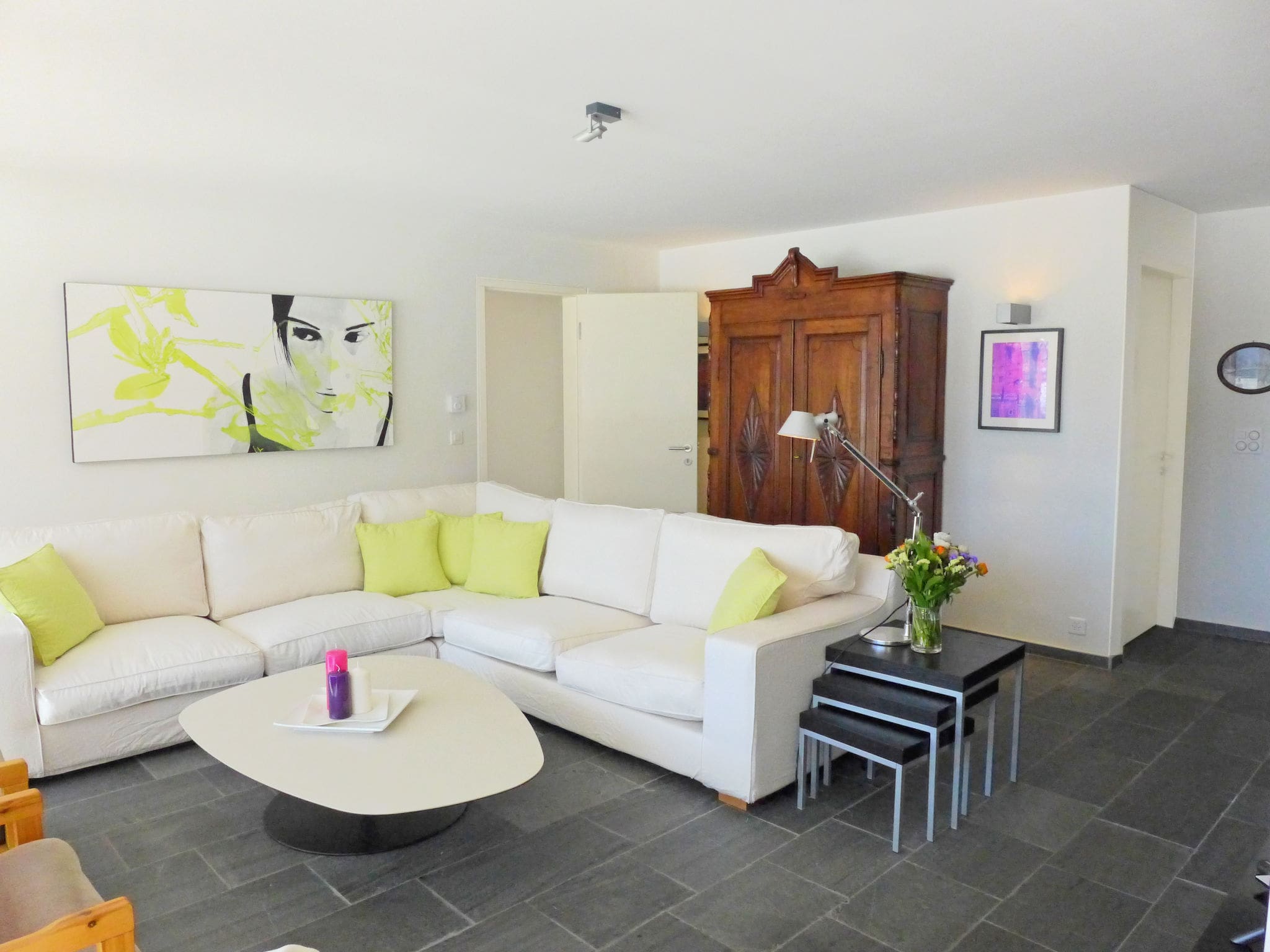 The property’s sunny south-facing position on a gentle slope maximizes natural light throughout the day while providing magnificent views across the Engadin Valley. The private balcony offers terrace furniture for outdoor dining and relaxation, creating an intimate space to appreciate the dramatic Alpine scenery. The residence includes covered parking, bicycle storage, and ski storage facilities, catering perfectly to active guests who wish to explore the surrounding mountains by foot, bike, or ski.