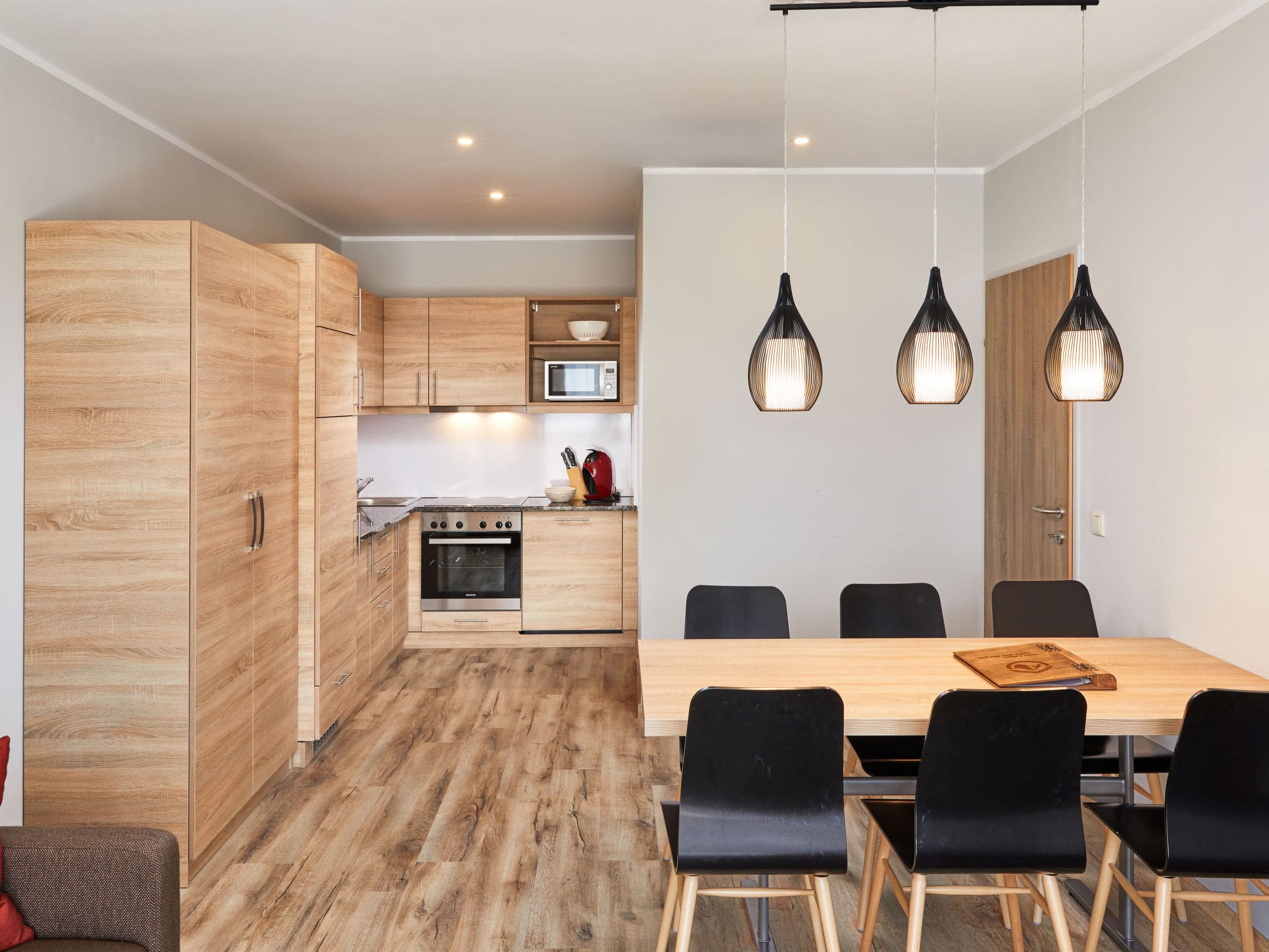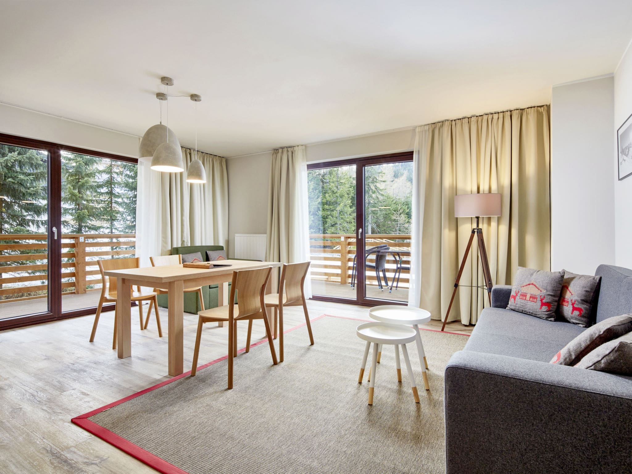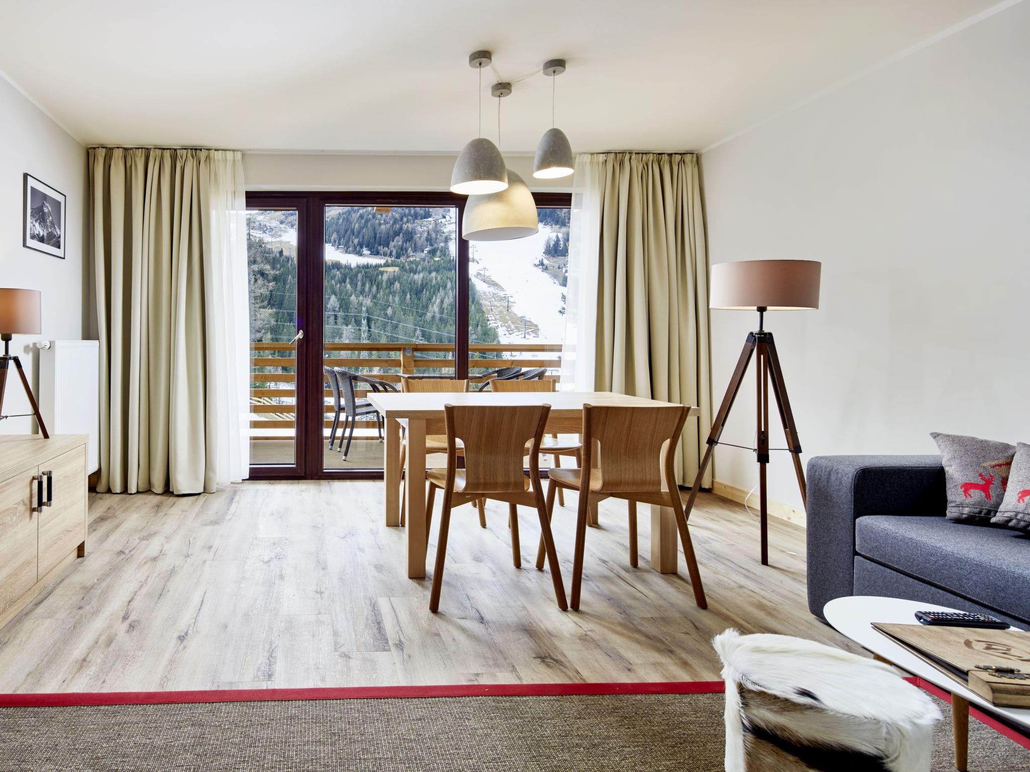This thoughtfully designed 58-square-metre apartment showcases modern alpine elegance with tasteful contemporary furnishings throughout. The open-plan living and sleeping area features a comfortable double sofa bed, dining space for four, and satellite television for relaxing evenings. The separate bedroom offers flexible sleeping arrangements with both a sofa bed and double bed, accommodating up to four adults plus one child. The fully equipped kitchen includes premium appliances such as a ceramic glass hob, dishwasher, microwave, and electric coffee machine for convenient self-catering. Two well-appointed bathrooms with modern fixtures ensure comfort and privacy for all guests. Beautiful parquet flooring and double-glazed windows enhance the sophisticated atmosphere while providing excellent insulation against mountain weather. The private balcony with outdoor furniture offers spectacular mountain and countryside vistas, creating the perfect spot for morning coffee or evening aperitifs.