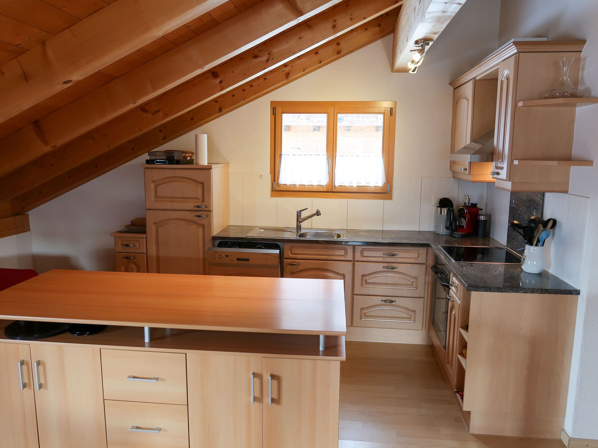 The open-plan kitchen provides everything needed for self-catering, from a full-sized oven and dishwasher to specialist Swiss entertaining equipment including a raclette grill and fondue set. Additional conveniences include a microwave, electric coffee machine, and four-ring ceramic hob. The property features a shower room with separate WC, modern amenities such as free WiFi throughout, and thoughtful touches including a hair dryer and balcony furniture.