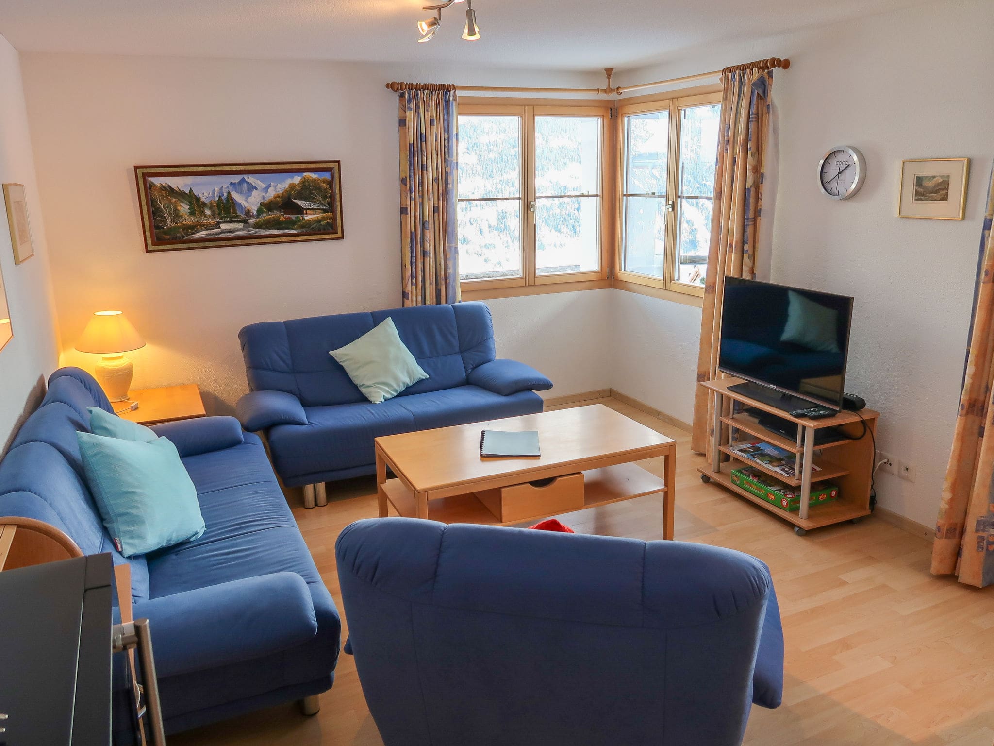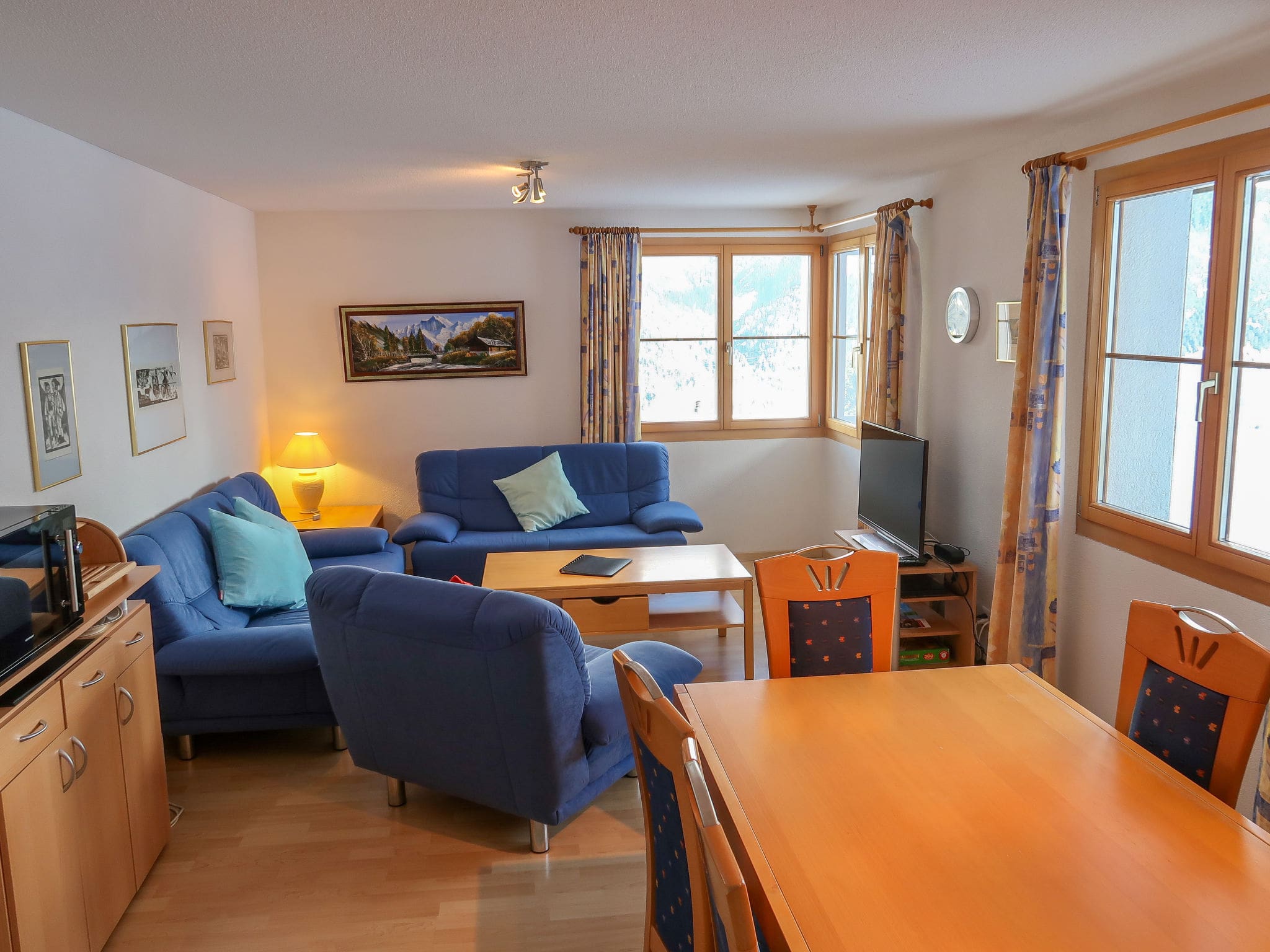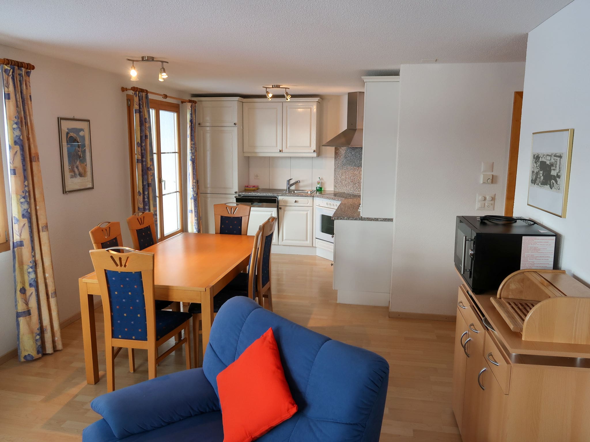 The 82-square-metre ground-floor apartment presents a harmonious blend of comfort and functionality across four well-designed rooms. The heart of the property lies in the open-plan living and dining area, featuring satellite television with flat screen and DVD player for relaxing evenings after days on the mountain. The contemporary open kitchen comes fully equipped with modern appliances including an oven, dishwasher, ceramic glass hob, microwave, electric coffee machine, and special Alpine touches like a raclette grill and fondue set for authentic Swiss dining experiences.