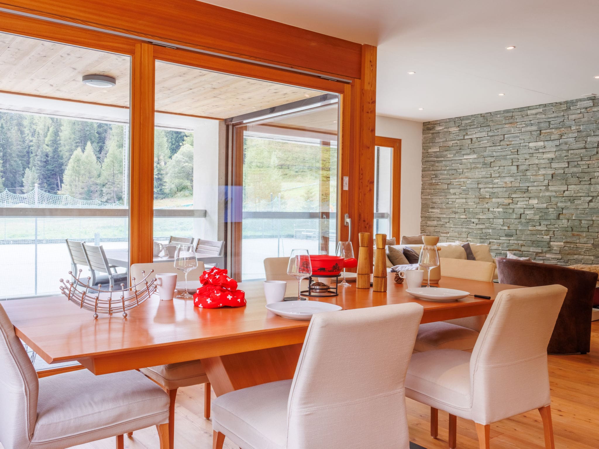 Spanning 109 square metres across a thoughtfully designed single level, this contemporary alpine apartment showcases modern Swiss mountain living at its finest. The bright, open-plan living and dining area features floor-to-ceiling panoramic windows that frame spectacular mountain vistas, while tasteful furnishings create an atmosphere of refined comfort. The master bedroom offers a luxurious king-size French bed and private en-suite bathroom complete with bathtub, while the second bedroom provides a comfortable double bed and dedicated shower room. The fully equipped kitchen features premium appliances including induction hob, dishwasher, and specialist equipment for traditional Swiss dining experiences including raclette grill and fondue set.