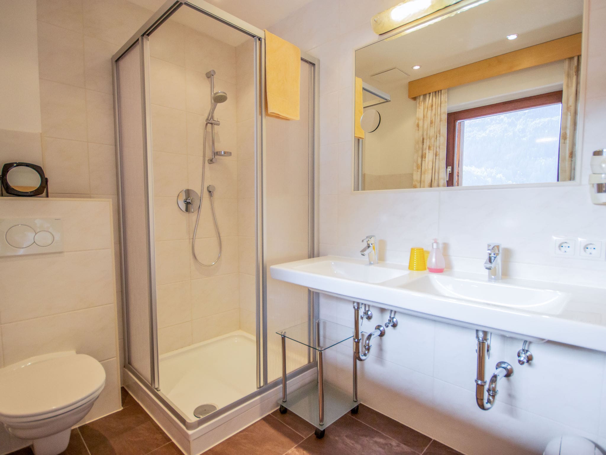 This spacious 117 square metre apartment spans the first floor of the modern Alpin residence, featuring contemporary country house styling that perfectly captures the alpine aesthetic. The accommodation comprises four beautifully appointed bedrooms, each equipped with cable television and flexible box spring beds that can be configured as doubles or singles to suit your group’s needs. The master bedroom offers a comfortable double bed setup, while the three additional rooms provide versatile sleeping arrangements for up to 11 guests.