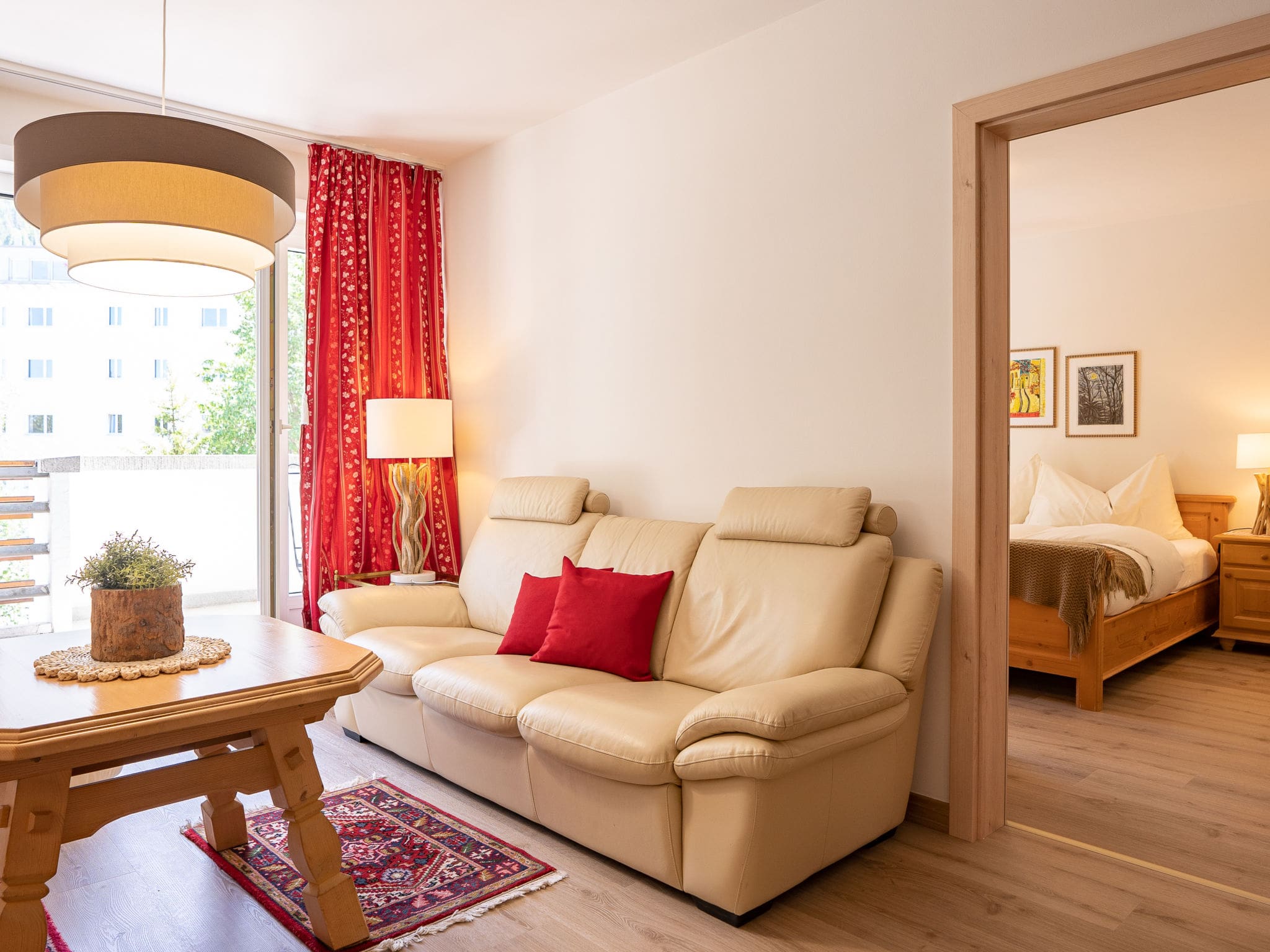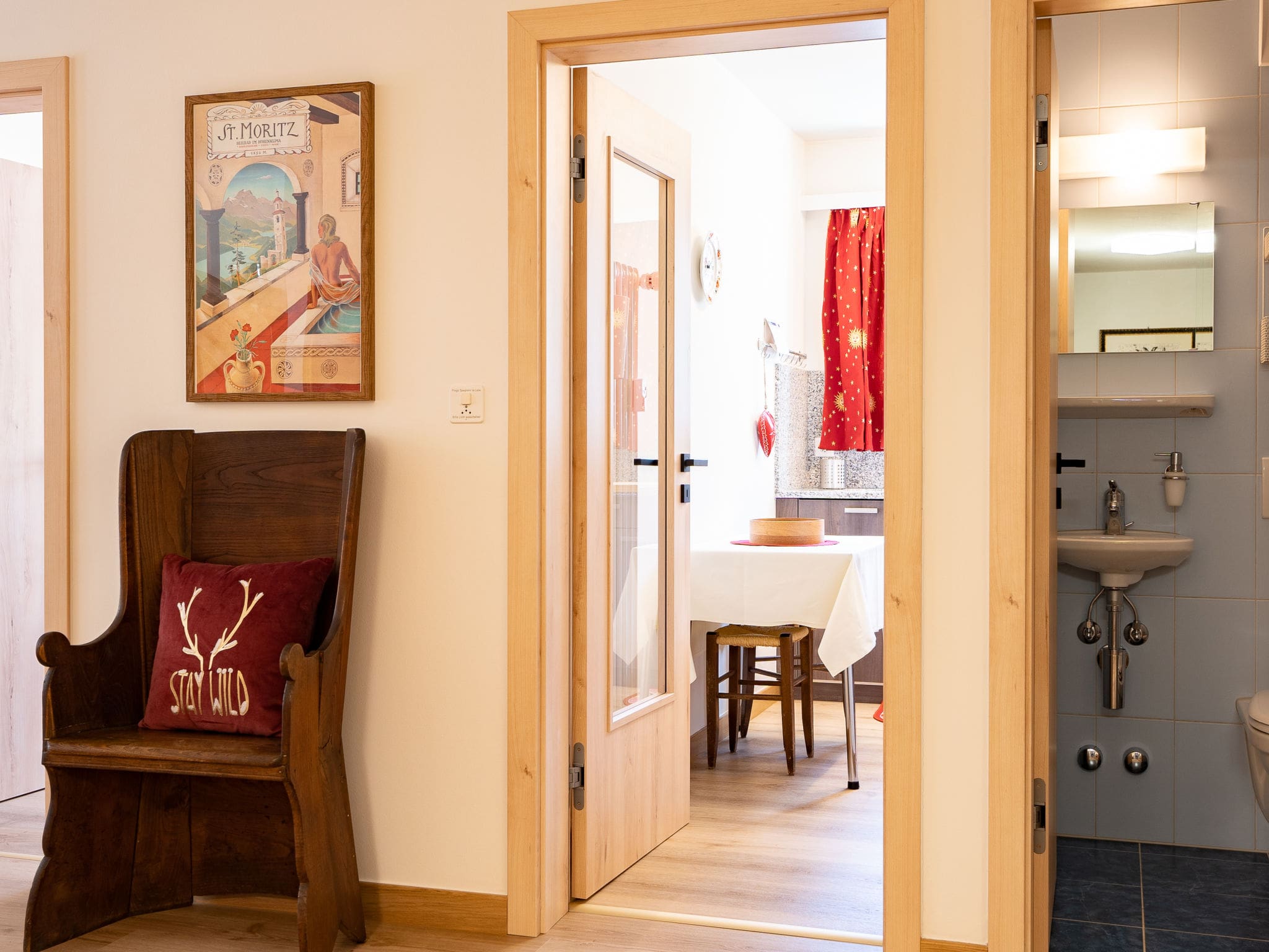 The south-facing 10-square-metre balcony provides stunning side views of the surrounding mountains, creating an intimate outdoor sanctuary where guests can savour morning coffee while breathing in the crisp alpine air. The balcony’s sunny orientation ensures maximum natural light throughout the day, while comfortable outdoor furniture invites relaxation after adventurous days on the slopes or exploring the surrounding valleys. Though there is no private pool, guests can access the indoor swimming pool just 300 metres away, plus the renowned thermal baths of Heilbad Zentrum St. Moritz within easy walking distance.