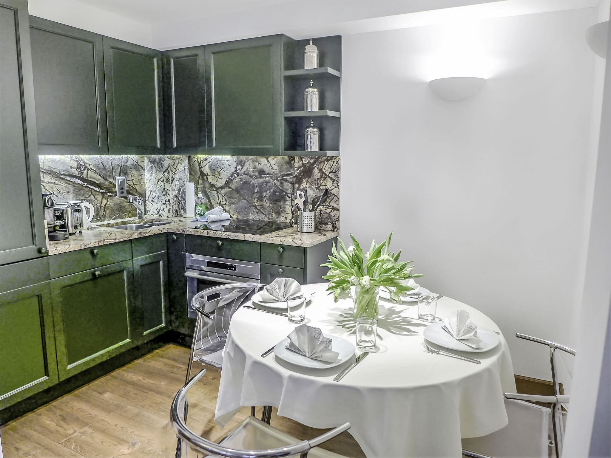 The apartment includes WiFi, iron, hair dryer, and environmentally conscious features such as LED lighting, renewable electricity, and water-efficient fixtures. The nearest major airports are Zurich (223 kilometres) and Milan Malpensa (185 kilometres), both easily accessible by car or public transport.