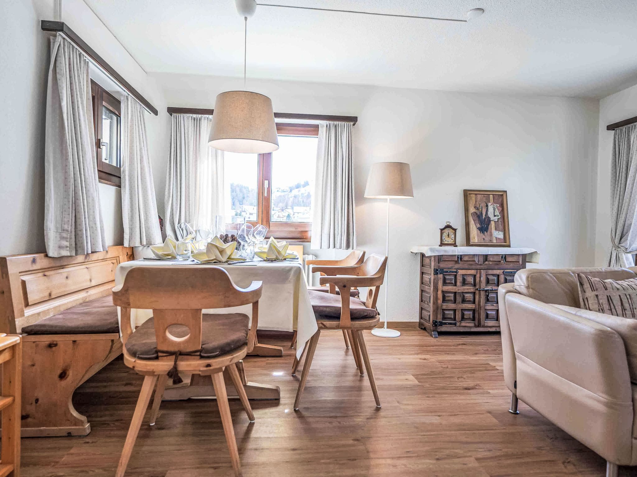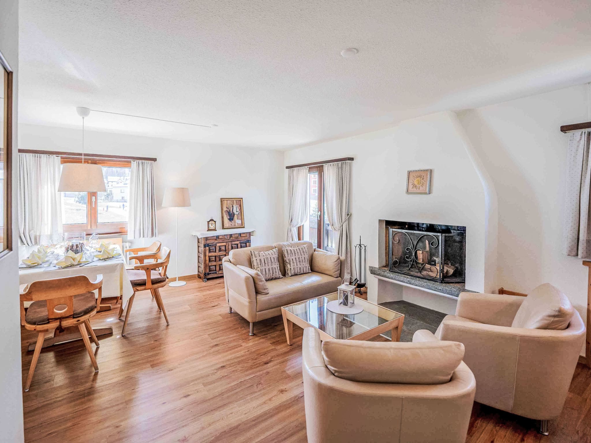 Spread across 70 square metres on the first floor of the elegant Chesa Mulin building, this beautifully appointed chalet combines traditional Alpine charm with modern comfort. The heart of the home features a welcoming living and dining area anchored by an authentic open-hearth fireplace, perfect for gathering after days spent on the slopes or mountain trails. Large windows frame spectacular mountain vistas, while the northwest-facing balcony provides an ideal spot for morning coffee with panoramic alpine views.