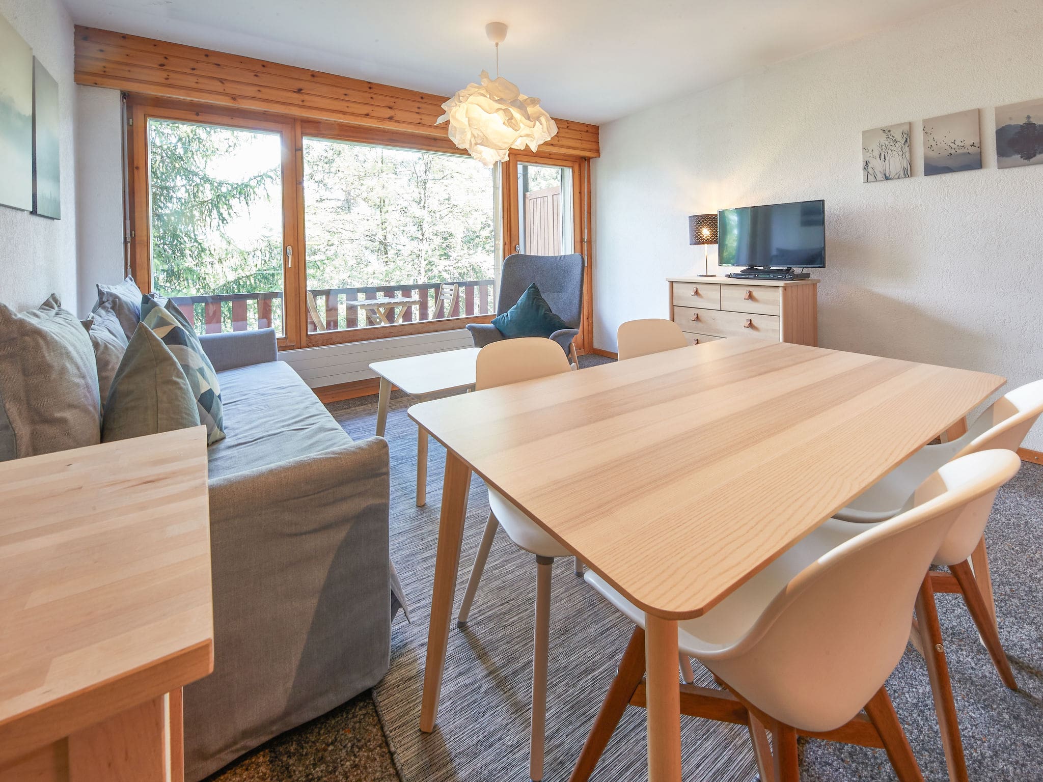 The 49-square-metre chalet showcases comfortable and tasteful furnishings throughout its well-appointed living spaces. The open-plan living and dining area features a practical sofa bed and cable television, creating a welcoming space for gathering after days on the slopes. Large windows flood the interior with natural light while offering beautiful views of the surrounding countryside. The separate bedroom accommodates two guests in single beds, ensuring peaceful nights at altitude. The open kitchen comes fully equipped with four hot plates, oven, microwave, and electric coffee machine, perfect for preparing hearty mountain meals. A modern bathroom with bathtub completes the interior, while the private balcony with outdoor furniture provides an ideal spot for morning coffee or evening aperitifs while taking in the mountain panorama.
