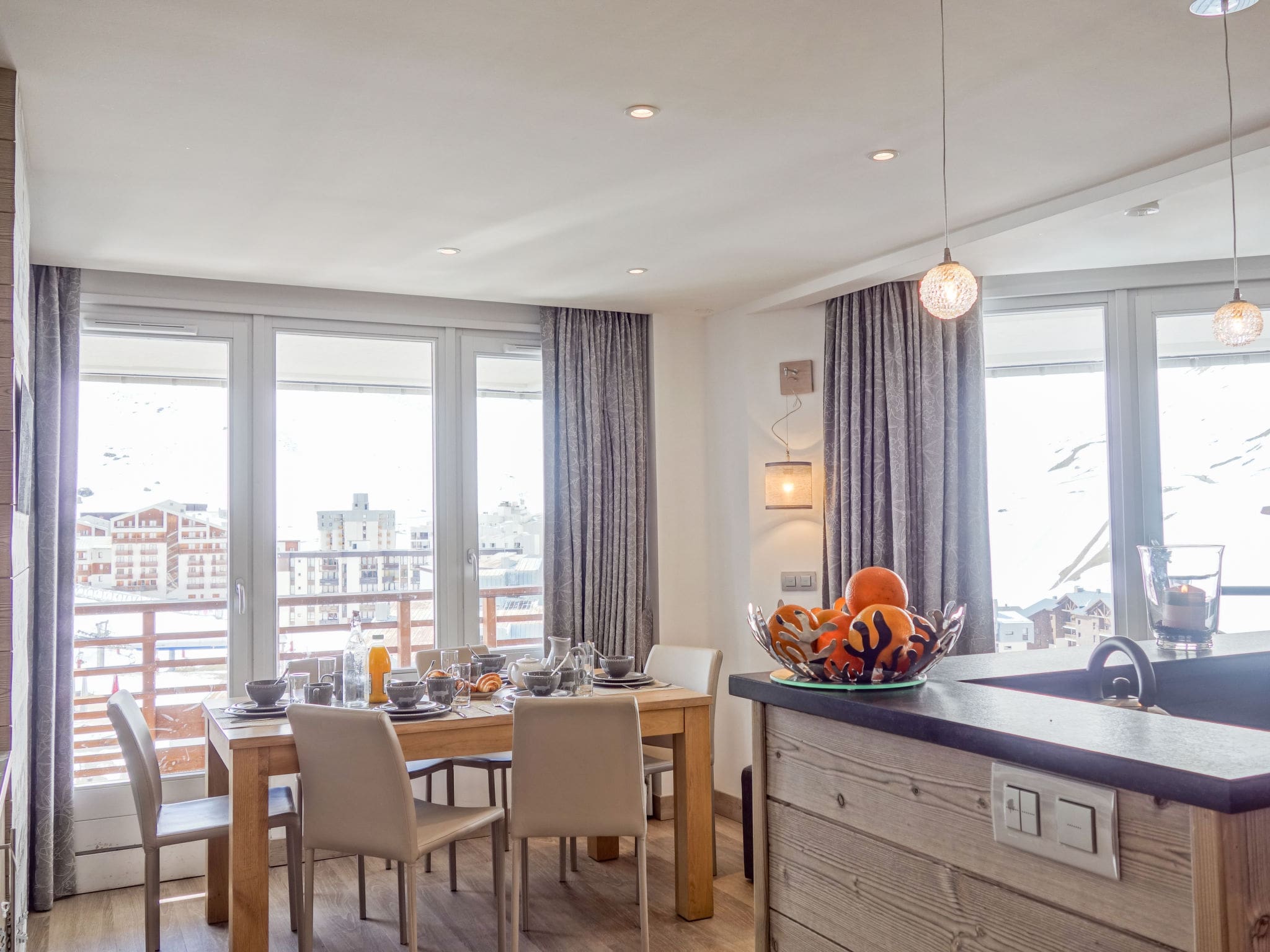 The apartment’s three south-facing balconies create exceptional outdoor living spaces with breathtaking Alpine panoramas. These elevated terraces offer front-row seats to the dramatic mountain theatre, where guests can watch skiers navigate the nearby runs while enjoying morning coffee or evening drinks. The balconies capture optimal sunlight throughout the day, creating warm microclimates perfect for outdoor dining even during crisp mountain weather. Professional deck chairs provide comfortable seating for extended periods of Alpine contemplation, while the expansive views stretch across the Espace Killy’s magnificent terrain.