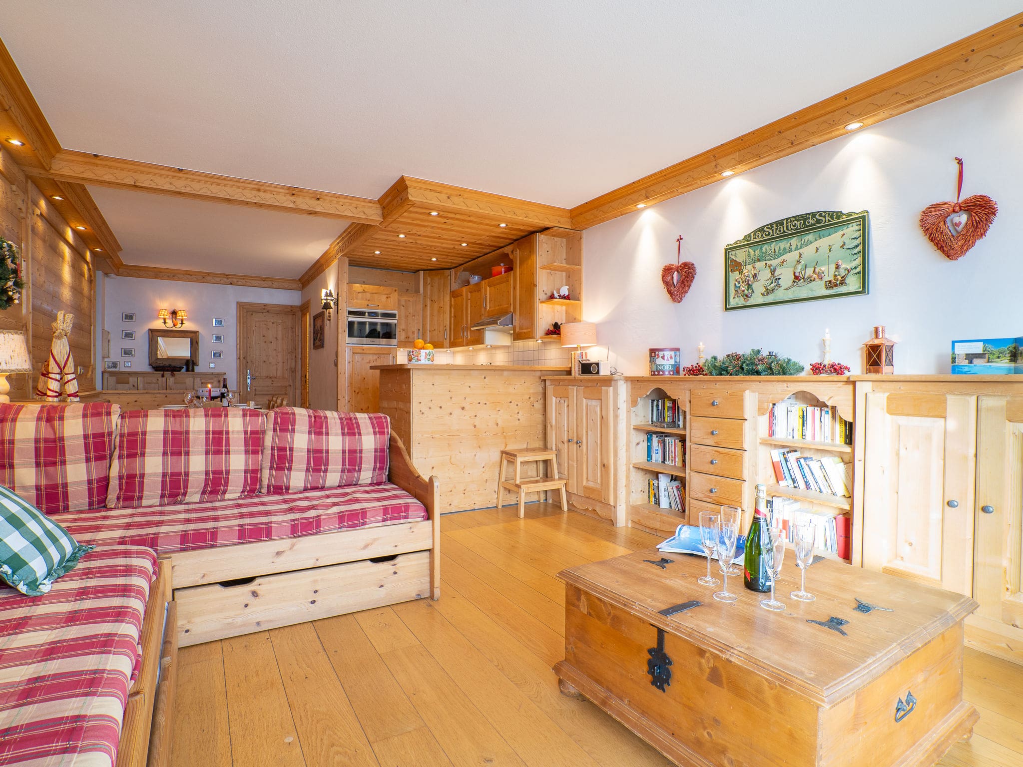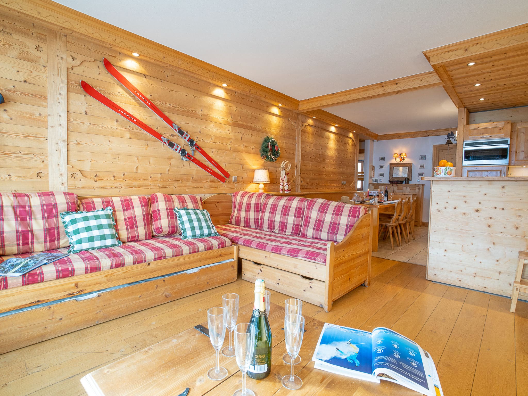 The 70-square-metre apartment features elegant wooden furnishings throughout, creating a warm and inviting atmosphere after days on the slopes. The spacious living and dining area serves as the heart of the property, furnished with comfortable seating and equipped with modern entertainment facilities including television and DVD player. The well-designed space flows seamlessly into a fully equipped kitchenette, complete with dishwasher, electric coffee machine, and combination microwave, making self-catering a pleasure rather than a chore.
