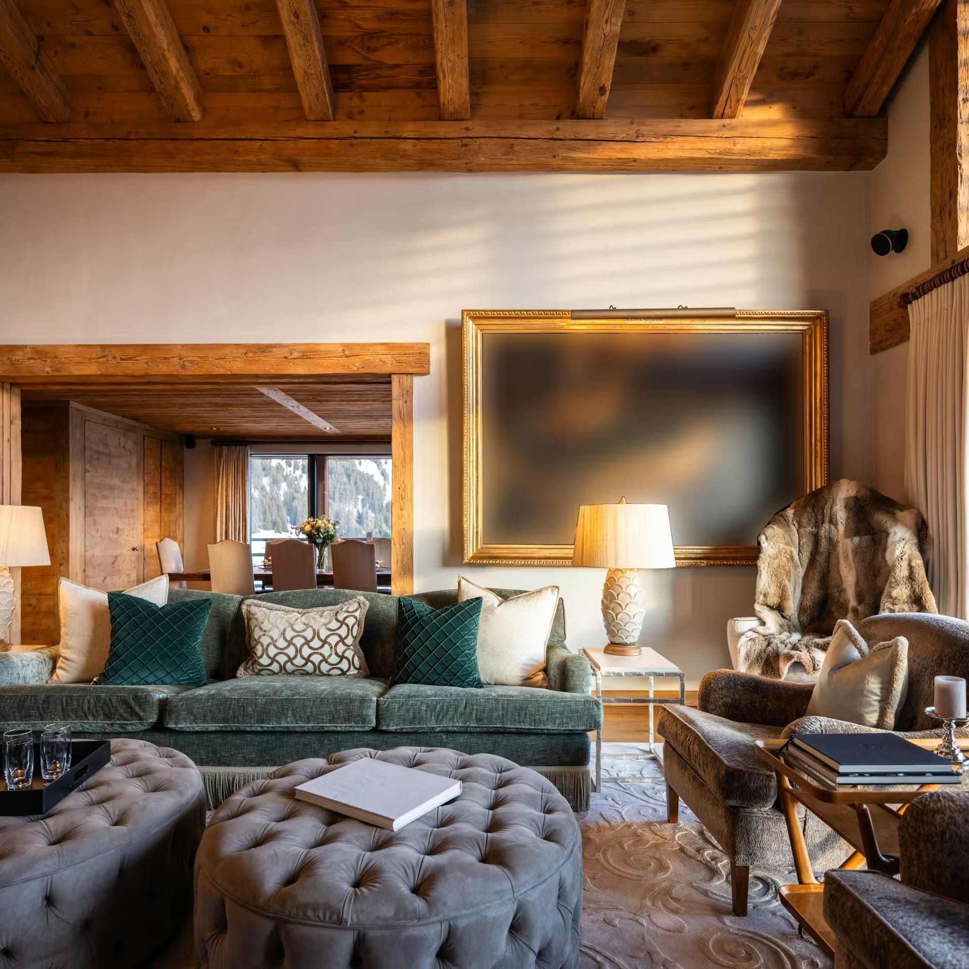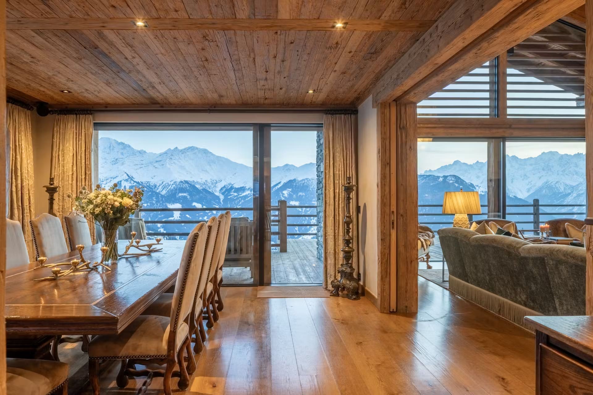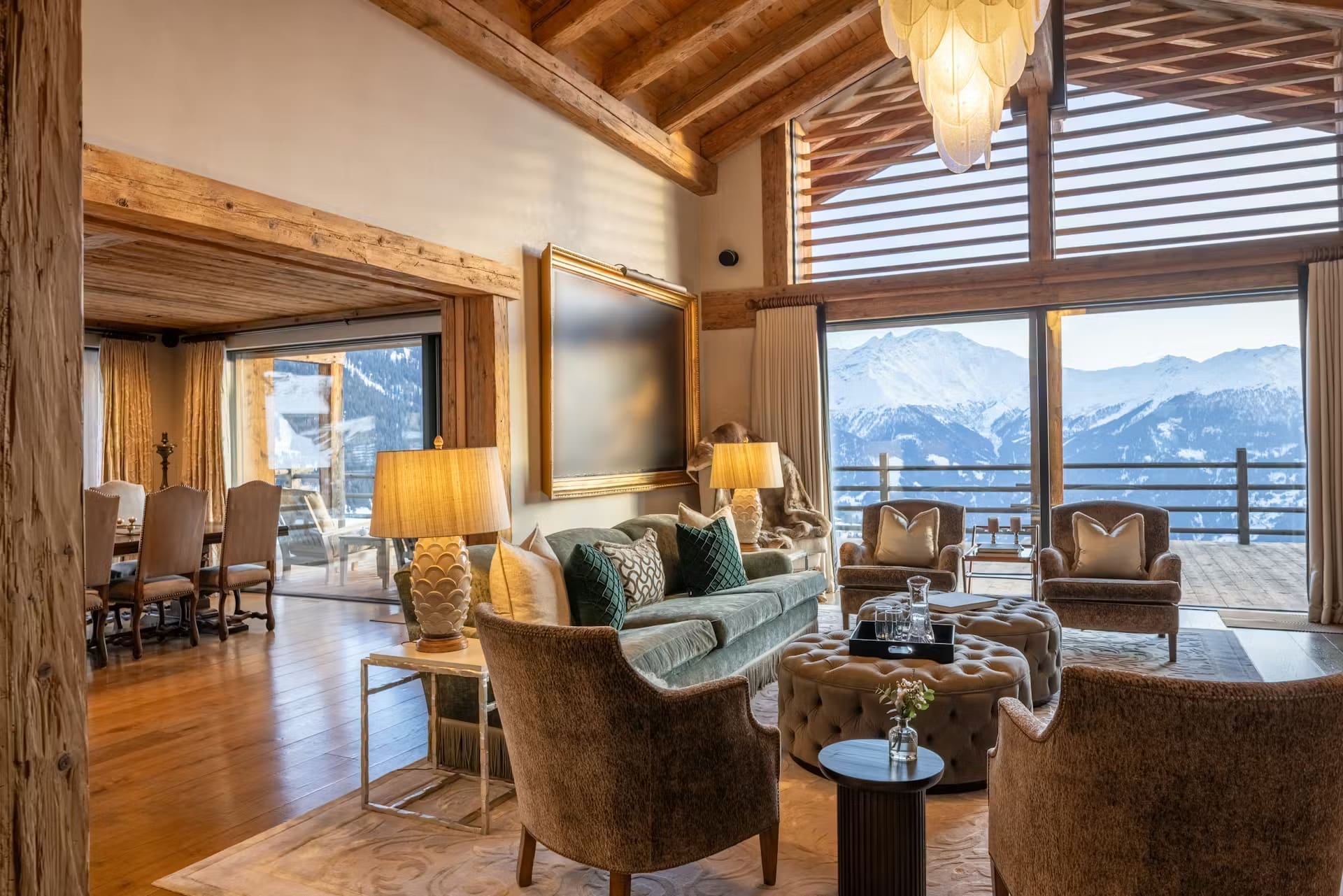 The expansive main living area features double-height ceilings and floor-to-ceiling windows that frame the Alpine panorama. A striking stone fireplace anchors the inviting lounge, where plush seating creates intimate gathering spaces. The open-plan design seamlessly connects to an elegant dining room and professional kitchen, where your private chef curates exquisite, personalised menus exclusively for your group. Alternatively, close off the spaces for more formal entertaining.
