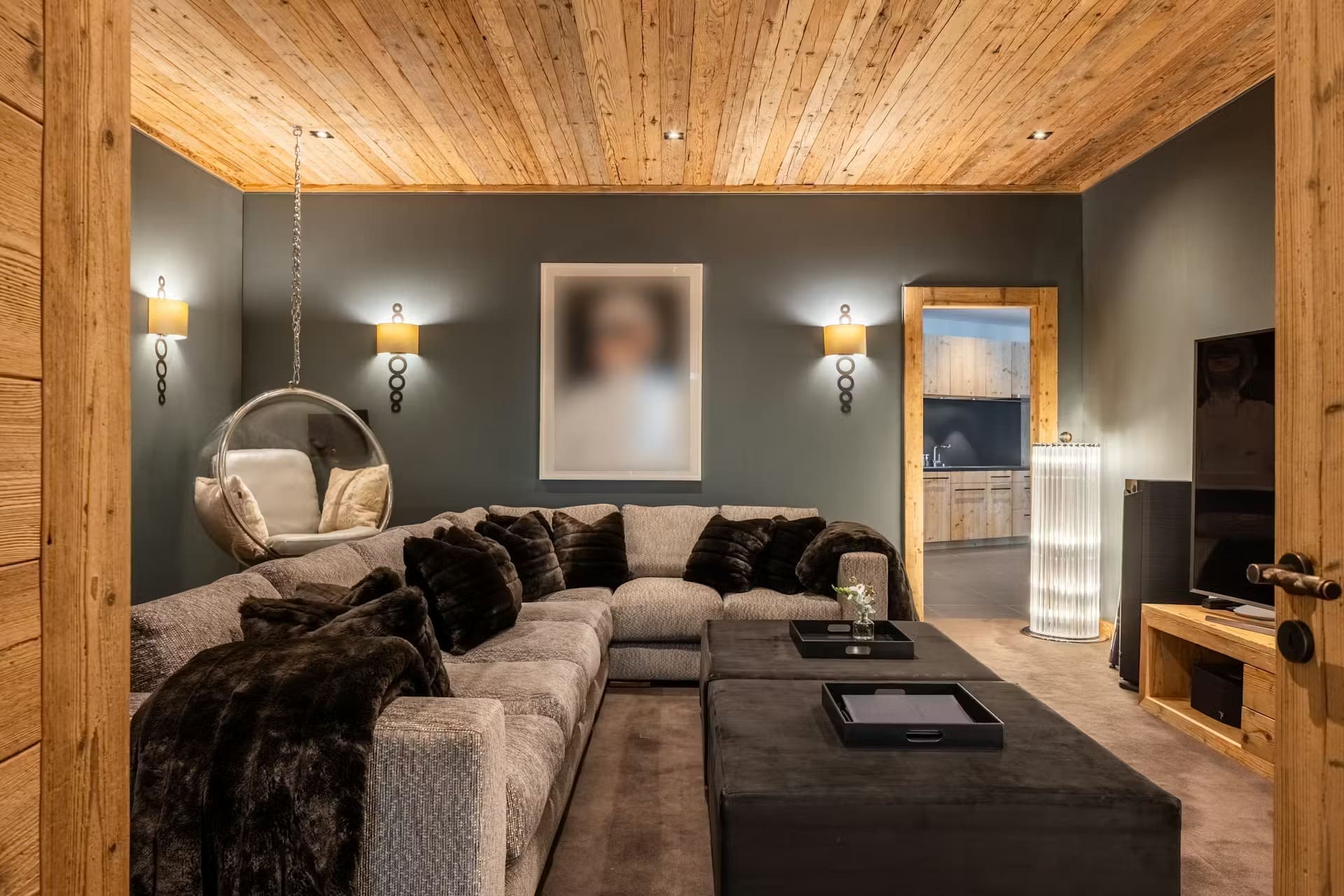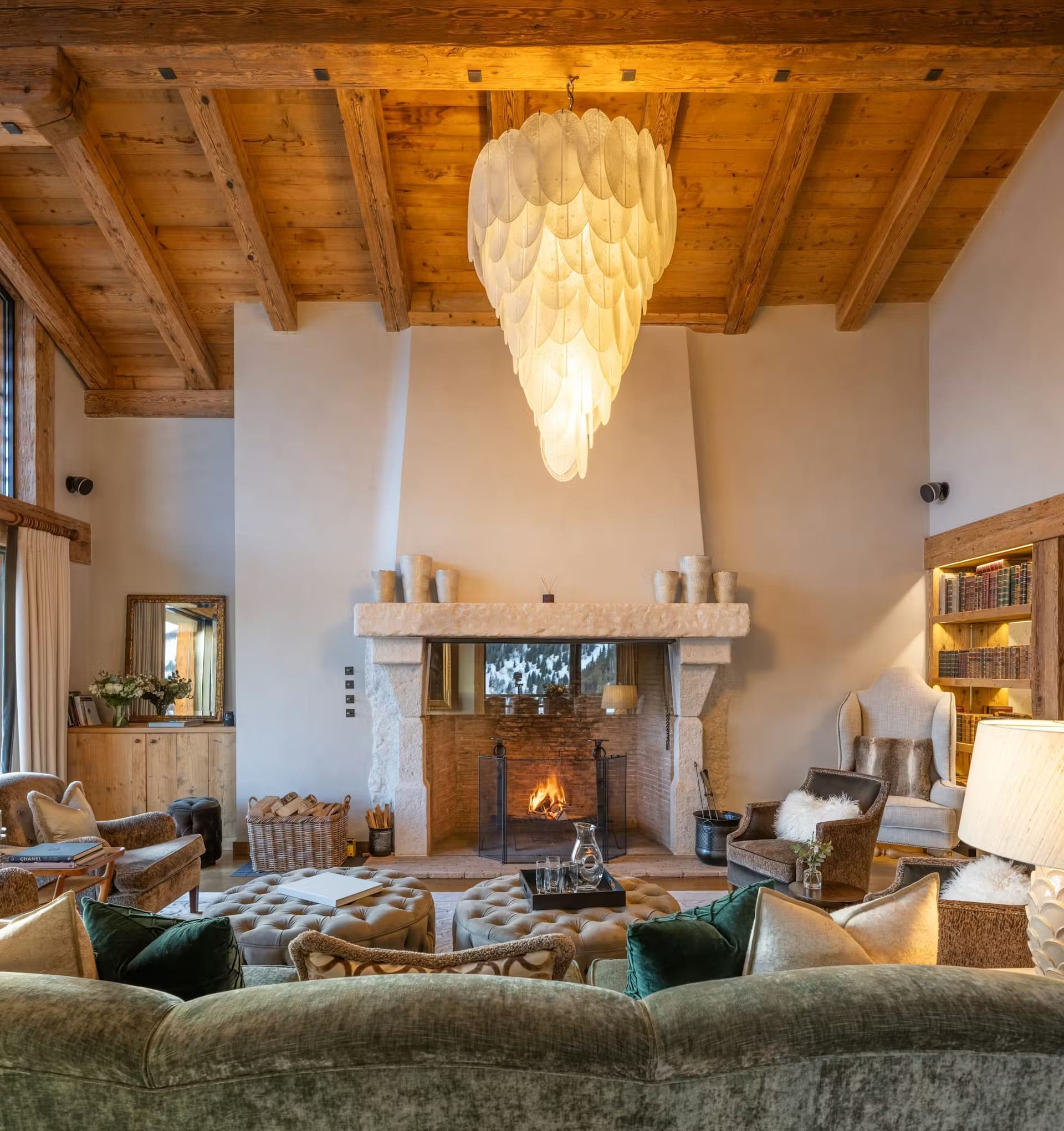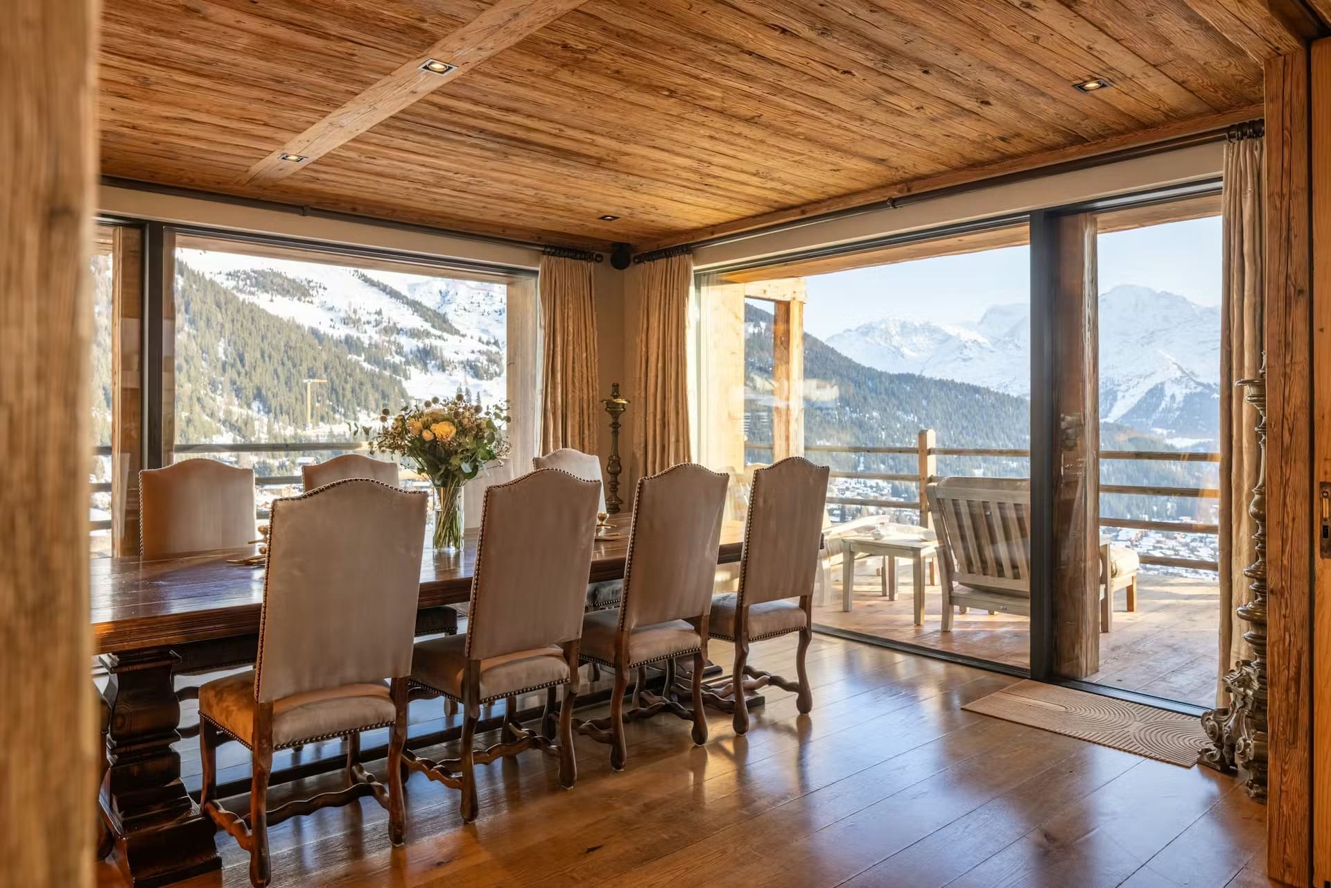The expansive main living area features double-height ceilings and floor-to-ceiling windows that frame the Alpine panorama. A striking stone fireplace anchors the inviting lounge, where plush seating creates intimate gathering spaces. The open-plan design seamlessly connects to an elegant dining room and professional kitchen, where your private chef curates exquisite, personalised menus exclusively for your group. Alternatively, close off the spaces for more formal entertaining.