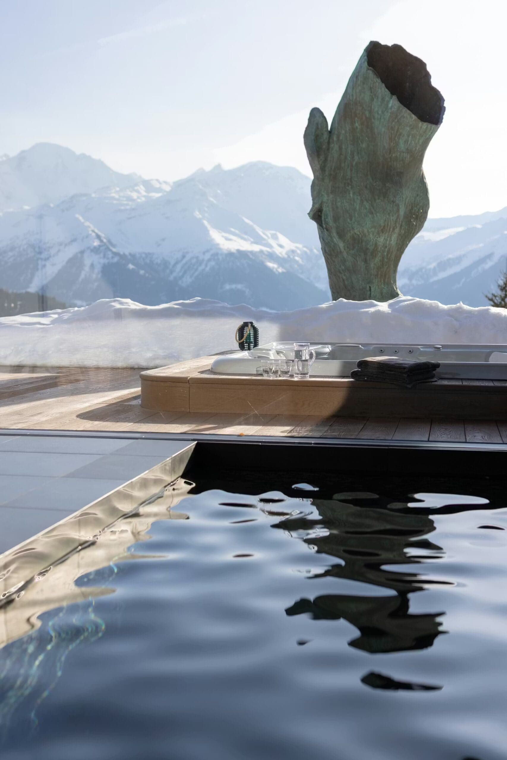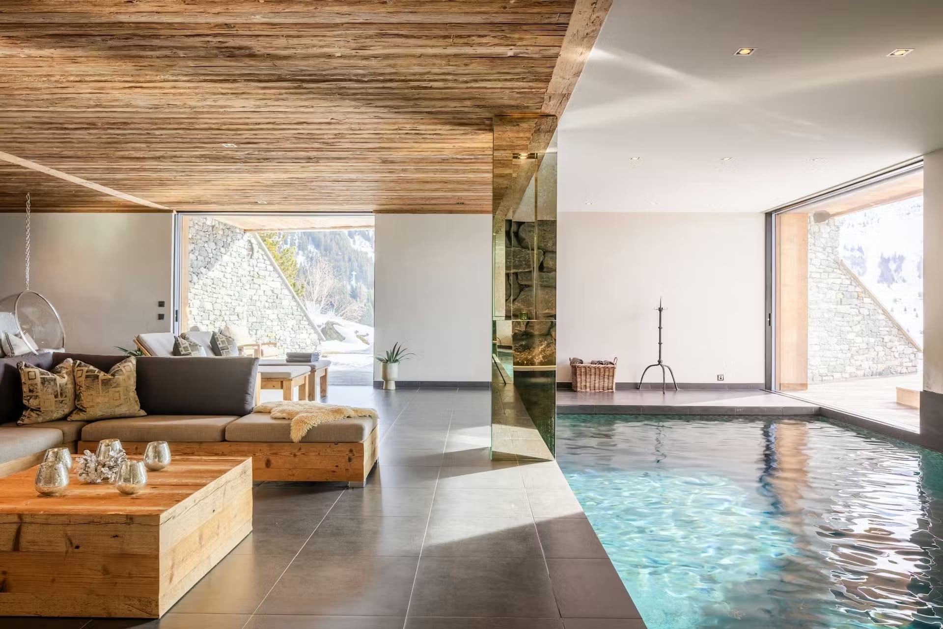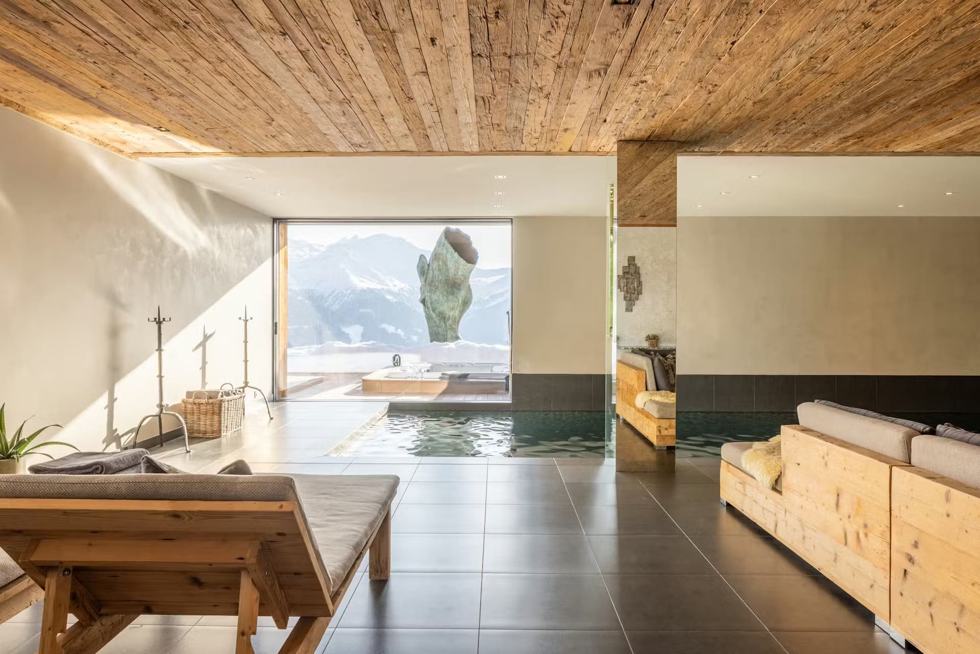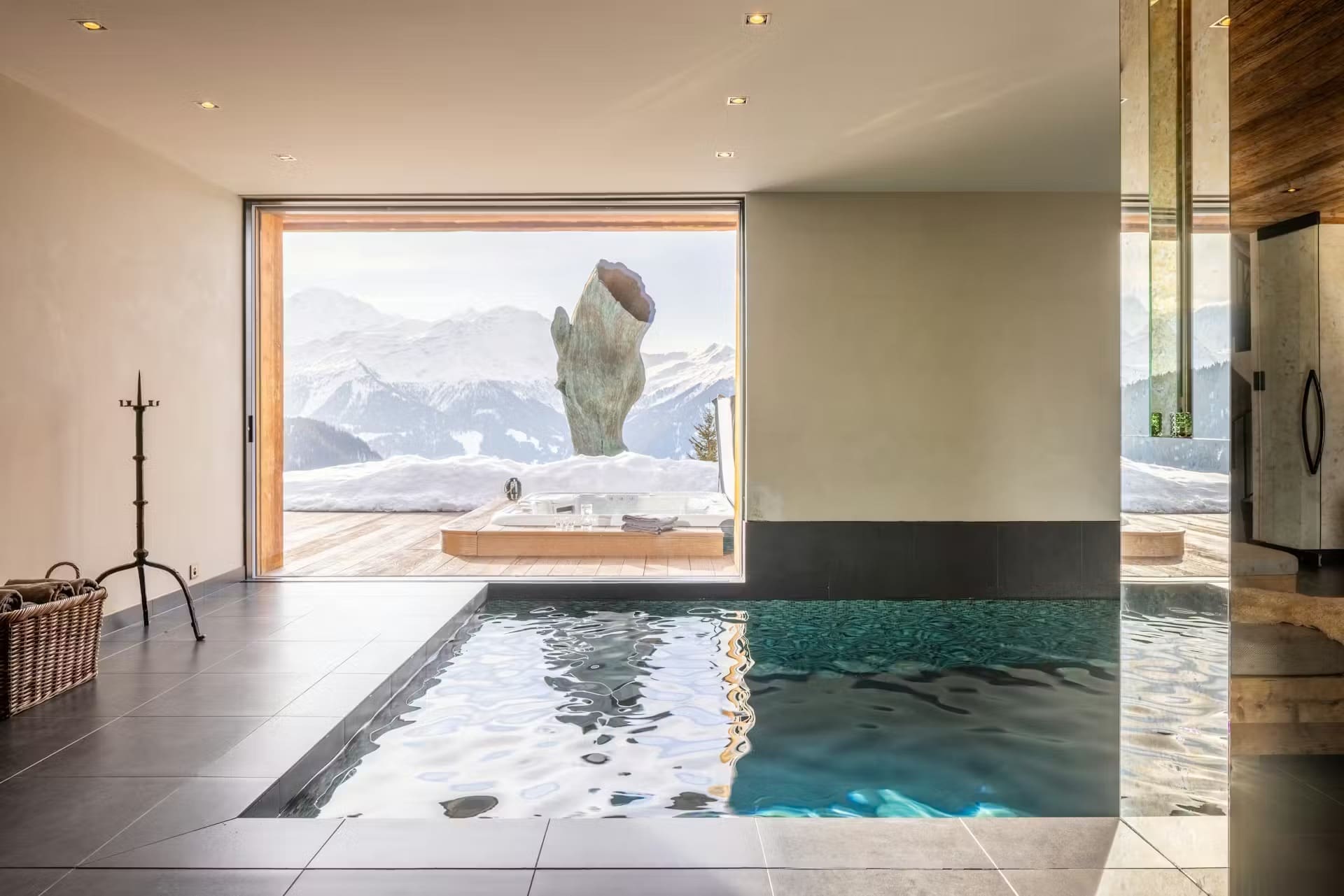 Chalet Mélèze’s opulent ground floor wellness area is an escape from everyday life. An heated indoor swimming pool maintains perfect temperature year-round, whilst an outdoor hot tub positioned beside the iconic horse statue offers soaking under the stars. The full-service spa features a professional sauna, authentic hammam, and two dedicated treatment rooms where qualified therapists provide massages, facials, and bespoke wellness treatments. A stylish wet lounge and bar complete this sanctuary of relaxation.
