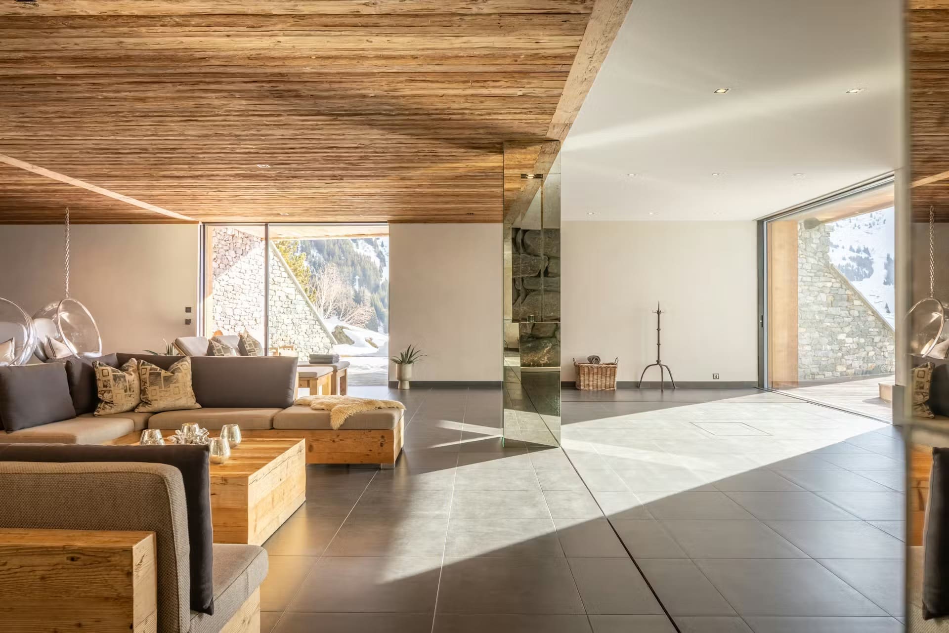 A fully equipped private gym features weights, cardio machines, and professional-grade equipment for maintaining your fitness routine. The dedicated ski room with boot warmers ensures your equipment is perfectly prepared for the following day’s descent. A private cinema room provides entertainment for evening enjoyment, whilst a second living room offers flexibility for multi-generational gatherings.