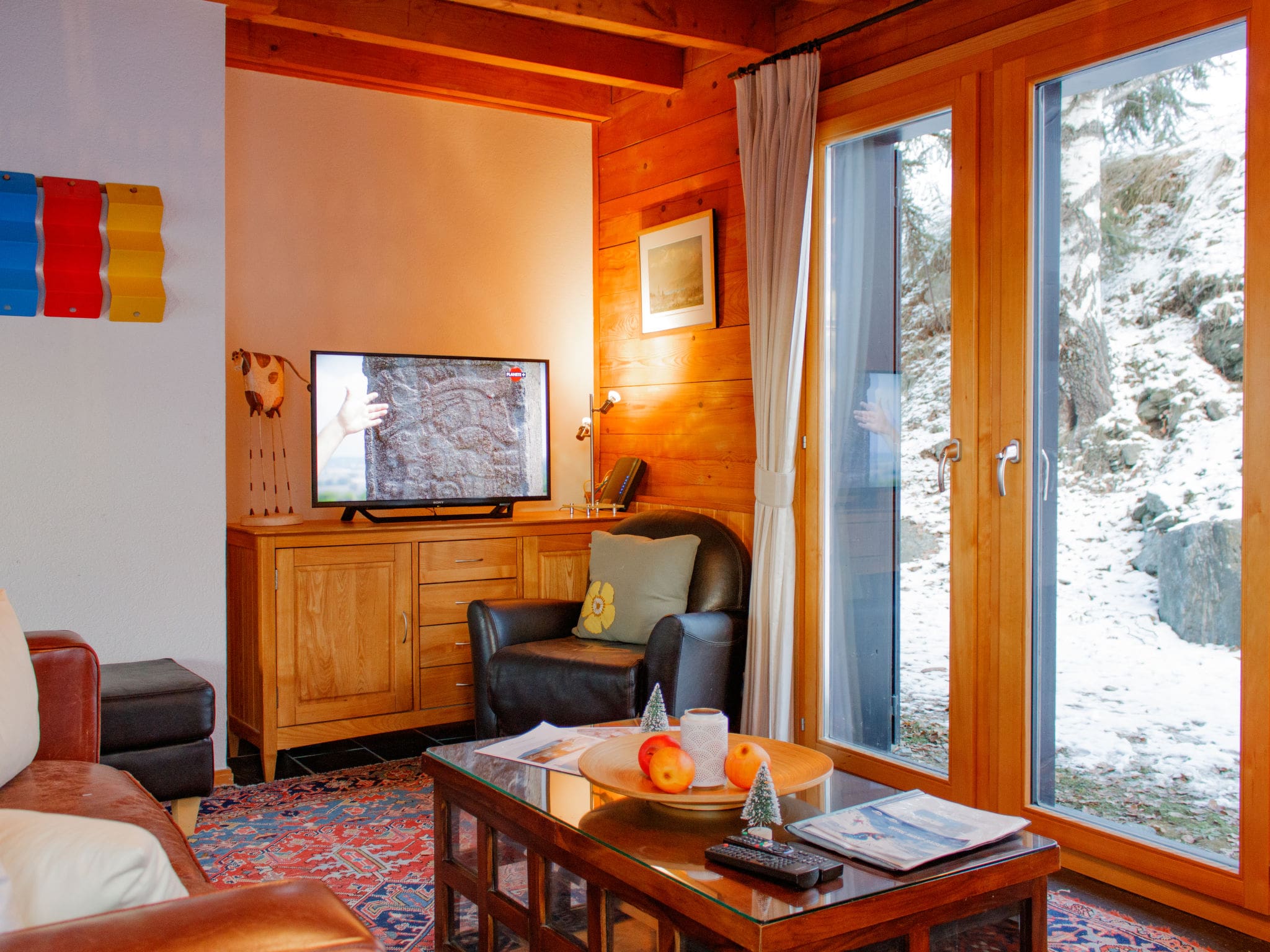 The chalet’s elevated position on a sunny slope maximizes both privacy and spectacular mountain panoramas. The large west-facing terrace captures afternoon light and sunset views, while the north-facing balcony offers different perspectives of the alpine landscape. Outdoor dining is enhanced by quality terrace furniture and a barbecue, perfect for summer evenings when the mountains glow in golden light.