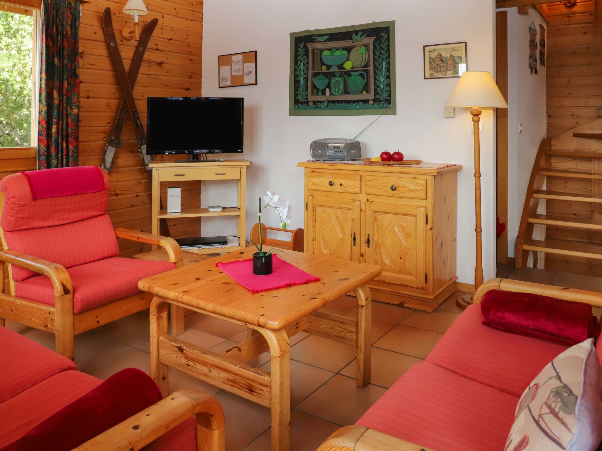 The 89-square-metre chalet spans two thoughtfully designed levels, accommodating up to eight guests across three bedrooms and two bathrooms. The open-plan living and dining area serves as the heart of the home, featuring a decorative open-hearth fireplace, cable television, hi-fi system, and DVD player. Large windows frame the spectacular mountain panorama, while the open gallery with sloping ceilings adds character and charm to the space. The fully equipped kitchen includes modern appliances including an oven, dishwasher, ceramic glass hob, electric coffee machine, and traditional Swiss cooking equipment including raclette grill and fondue sets for authentic mountain dining experiences.