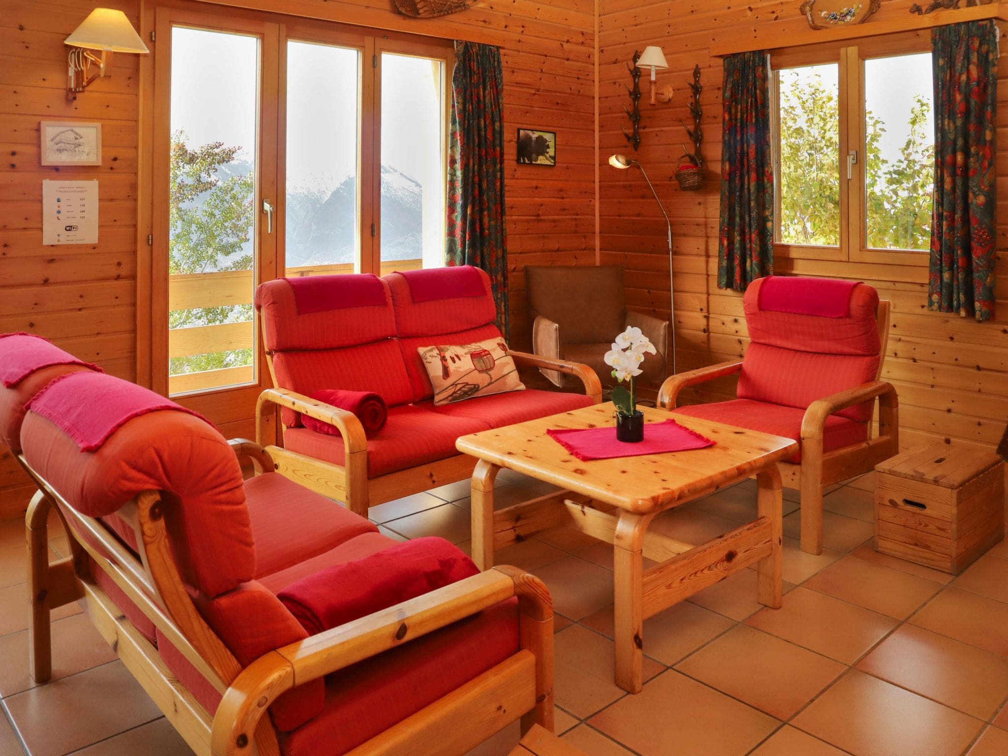 Multiple outdoor spaces enhance the Alpine experience, with balconies, terraces, and a patio offering various vantage points to appreciate the stunning mountain scenery. The north-west facing orientation provides excellent natural light throughout the day, while the elevated position ensures unobstructed views of the surrounding peaks. The outdoor areas are perfect for morning coffee while watching the sunrise paint the mountains, or evening aperitifs as the alpenglow illuminates the landscape. A private garage accommodates one vehicle, providing secure parking during both summer hiking seasons and winter snow conditions.