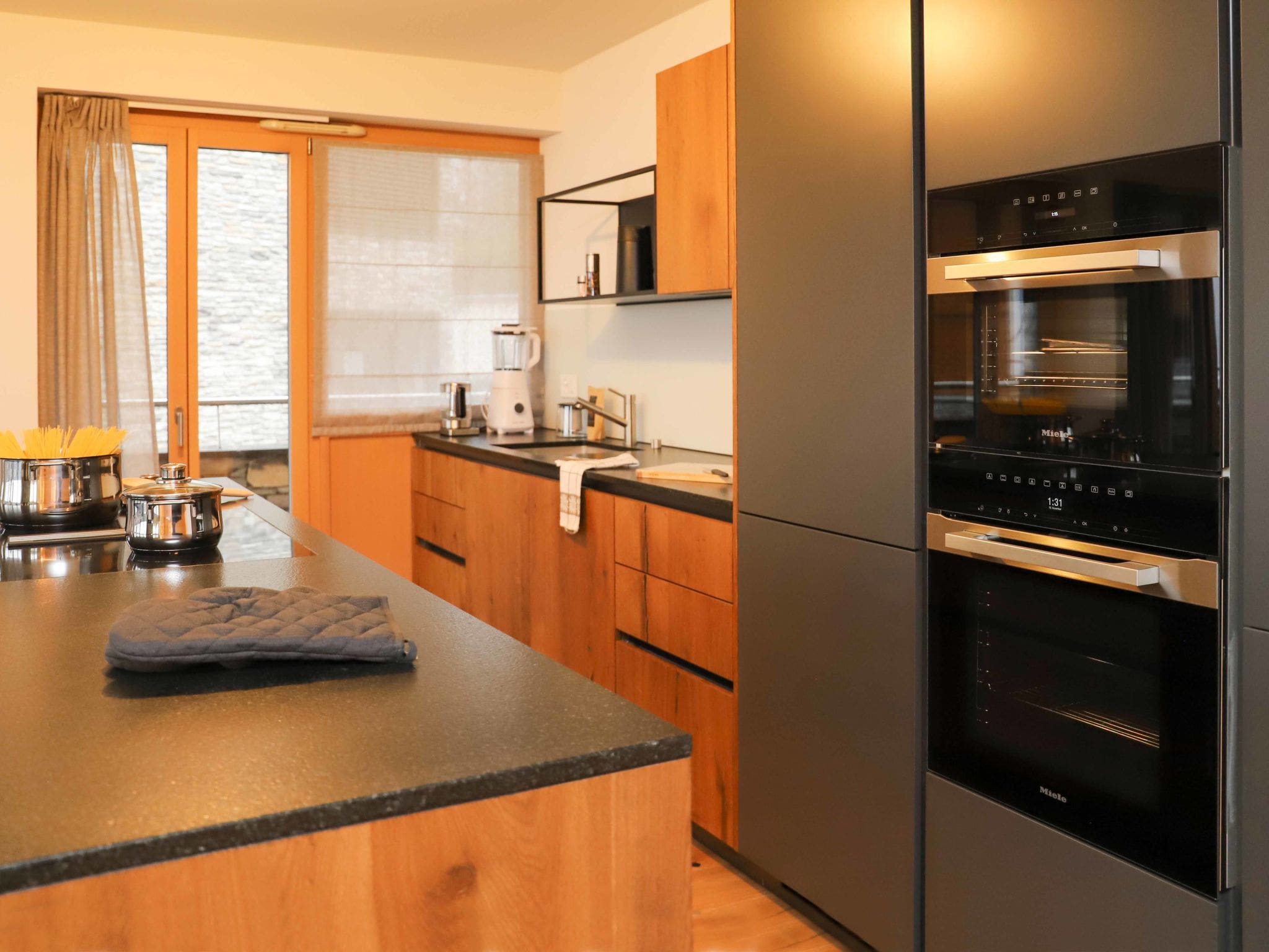 The contemporary kitchen comes fully equipped with premium appliances including an induction hob, oven, dishwasher, and freezer, making it easy to prepare meals using fresh local ingredients. Additional conveniences include a washing machine, dryer, and complimentary Wi-Fi throughout the property.