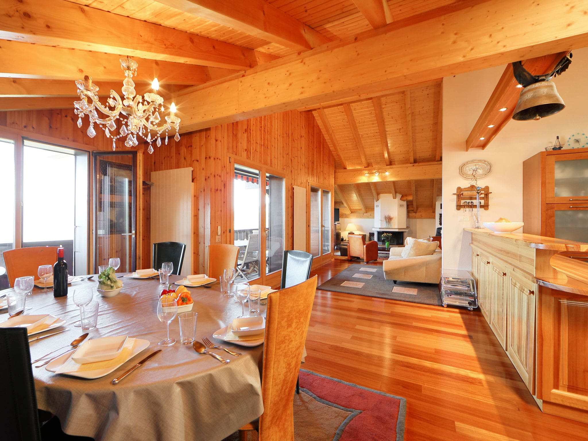 The fully equipped gourmet kitchen showcases modern appliances including a four-burner ceramic hob, dishwasher, microwave, and premium coffee machine. Traditional Swiss touches include a raclette grill and fondue set, perfect for authentic Alpine dining experiences. Five carefully appointed bedrooms accommodate up to 10 guests, with a master suite featuring a luxurious French bed and additional rooms offering twin configurations. Four beautifully finished bathrooms, including options with both bathtubs and showers, ensure comfort and convenience throughout your stay.