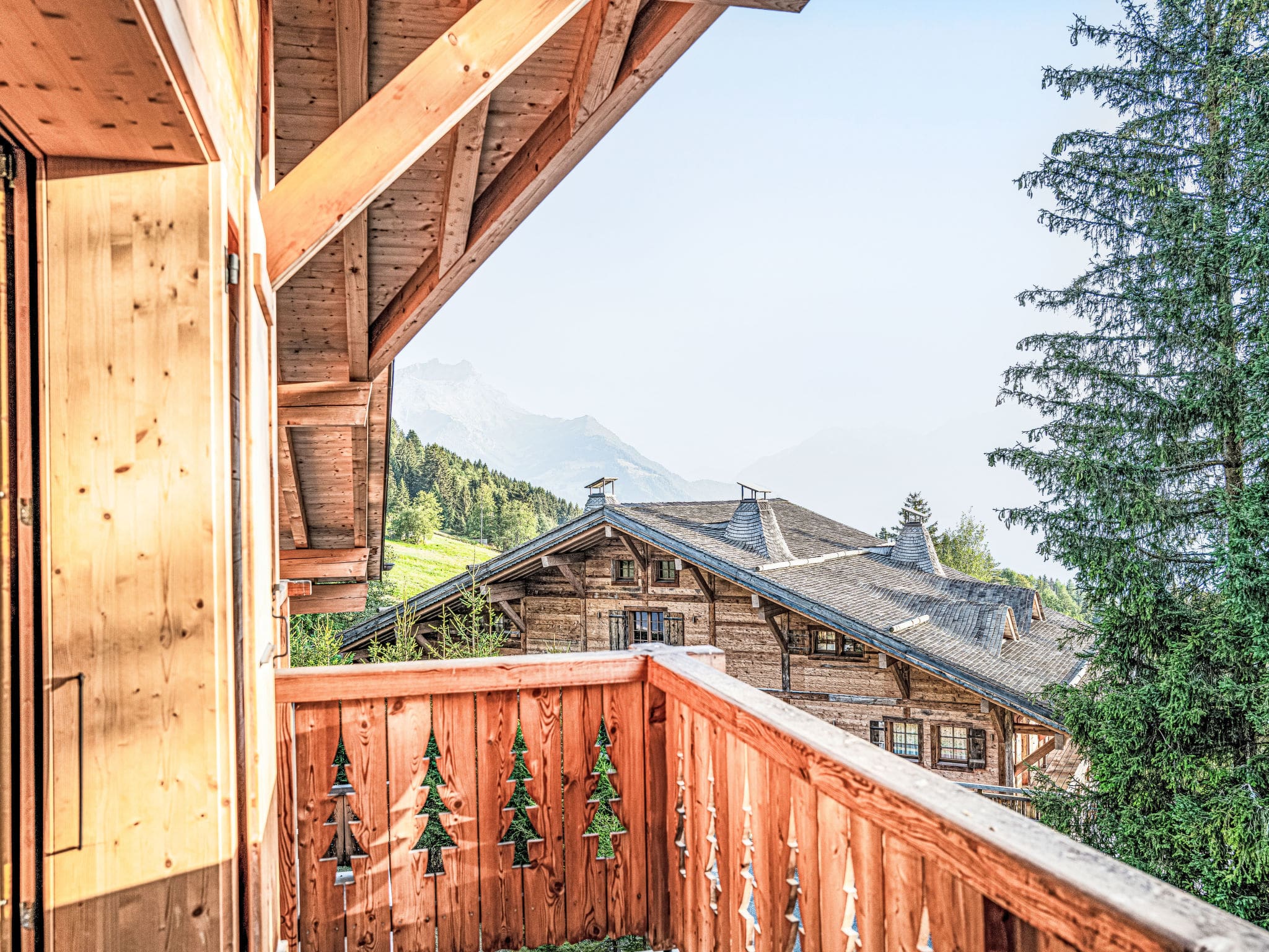Multiple outdoor spaces invite guests to embrace the mountain lifestyle at every level of this remarkable property. The main terrace extends the living areas outdoors, providing the perfect setting for morning coffee with forest views or evening drinks under the stars. Garden-level terraces from the lower bedrooms create intimate outdoor retreats, while upper-level balconies capture the changing light throughout the day. The property’s position among towering trees ensures complete privacy while maintaining spectacular vistas of the surrounding Alpine landscape.