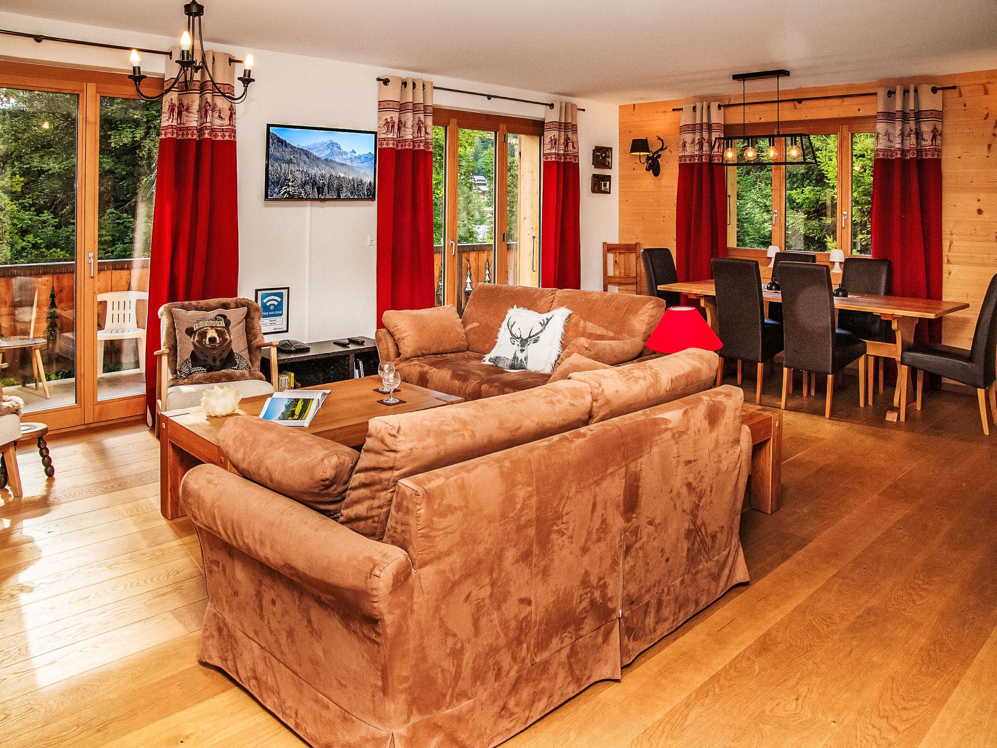 Four carefully appointed bedrooms accommodate up to nine guests across the property’s multiple levels. The master suite features a luxurious French bed and private shower room with direct access to a west-facing balcony. Two twin bedrooms on the lower ground floor each offer garden access and private bathrooms, while the upper-level bedroom with three single beds provides flexible accommodation for families or groups. Every room captures views of the surrounding forest, creating a sense of complete immersion in the alpine environment.