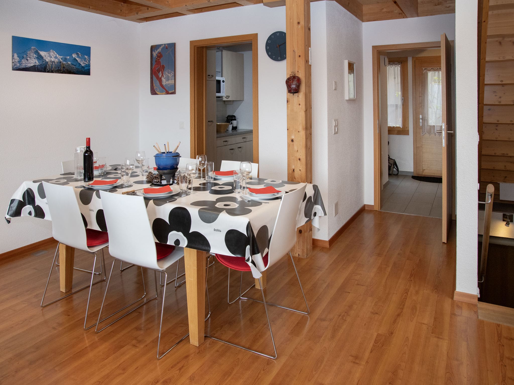 The fully equipped kitchen represents culinary excellence with premium appliances including a ceramic glass hob, dishwasher, microwave, and Nespresso coffee machine. Traditional Swiss touches include a fondue set for authentic alpine dining experiences. Three comfortable bedrooms accommodate up to eight guests, with the master suite featuring twin beds that can be configured as a double, while the family room cleverly combines bunk beds with a double bed to maximize space. Two well-appointed bathrooms include both shower and bathtub facilities, with modern fixtures and underfloor heating for ultimate comfort.