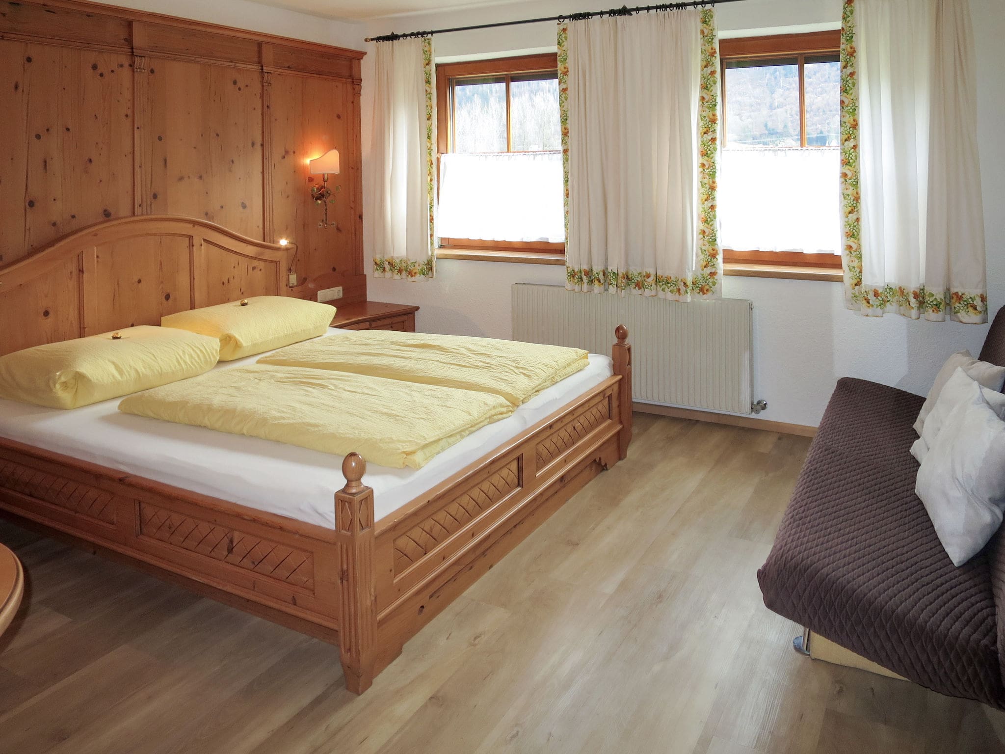 Four well-appointed bedrooms accommodate up to 10 guests across various sleeping arrangements, including double bedrooms and comfortable sofa beds. Two full bathrooms, including one en-suite, feature efficient shower facilities, while double-glazed windows ensure peaceful nights after active mountain days. The chalet’s authentic alpine character shines through its wooden beams and traditional furnishings, while modern amenities like satellite TV, WiFi, and oil heating ensure complete comfort throughout your stay.