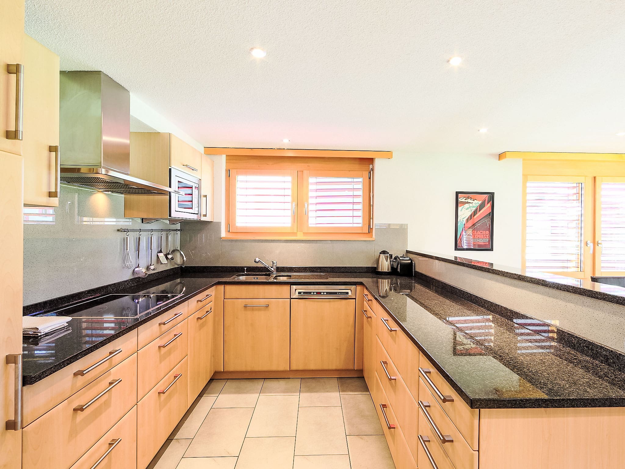 The open-plan living and dining area centres around a magnificent Scandinavian wood stove, creating an inviting atmosphere after days spent on the slopes. Modern furnishings complement the alpine setting, while the fully equipped kitchen features premium appliances including a dishwasher, ceramic hob, and speciality equipment for preparing traditional Swiss dishes like raclette and fondue.