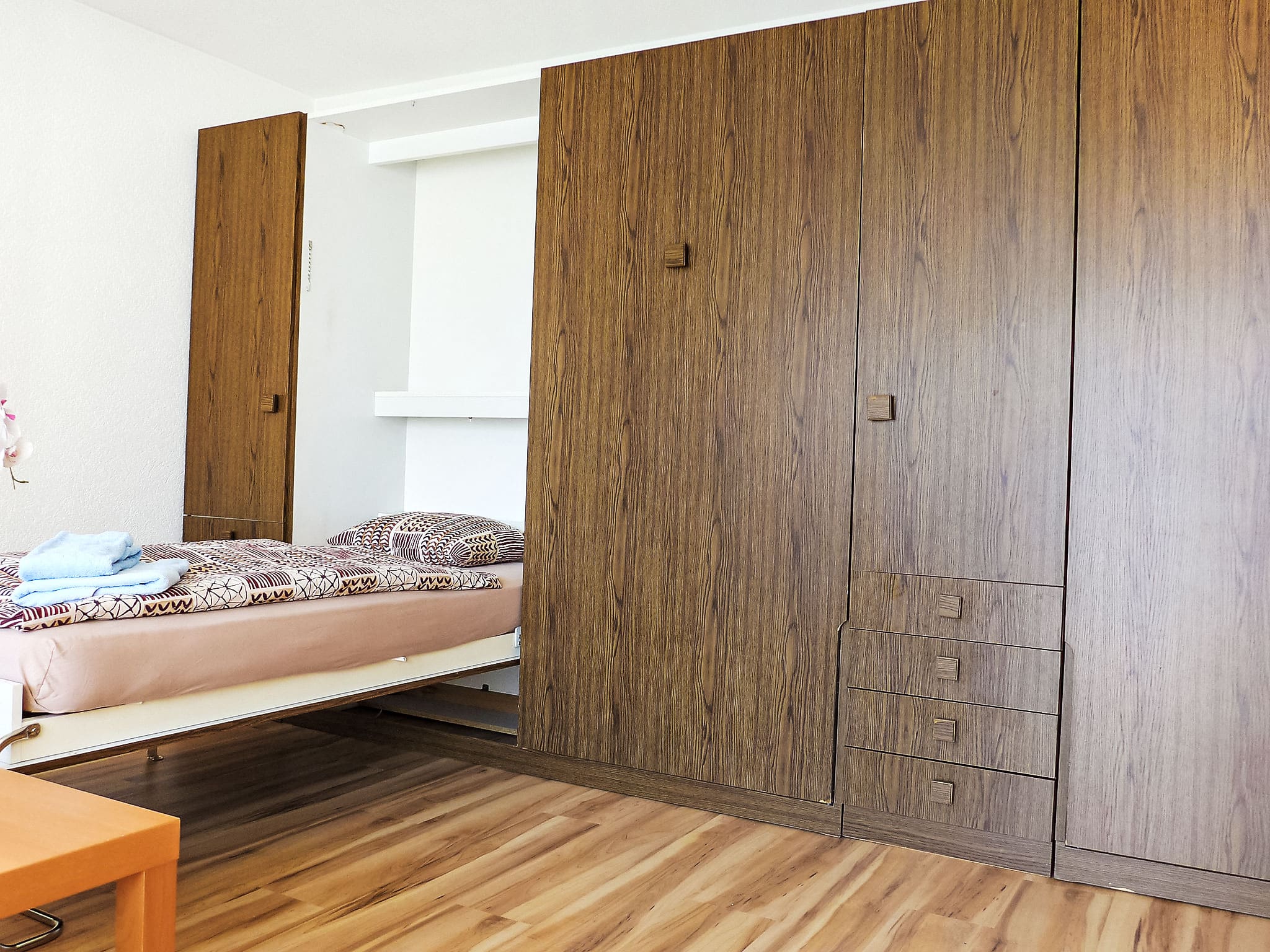 The 64-square-metre apartment combines traditional Alpine charm with modern comfort across its thoughtfully designed living spaces. The main living area features three comfortable fold-away beds and serves as both a relaxing lounge and additional sleeping space, with direct access to the sunny south-facing balcony. A separate bedroom houses a double bed, ensuring privacy and comfort for couples or families. The bright, cosy interior design maximises natural light while creating an inviting atmosphere perfect for unwinding after days spent exploring the mountains.
