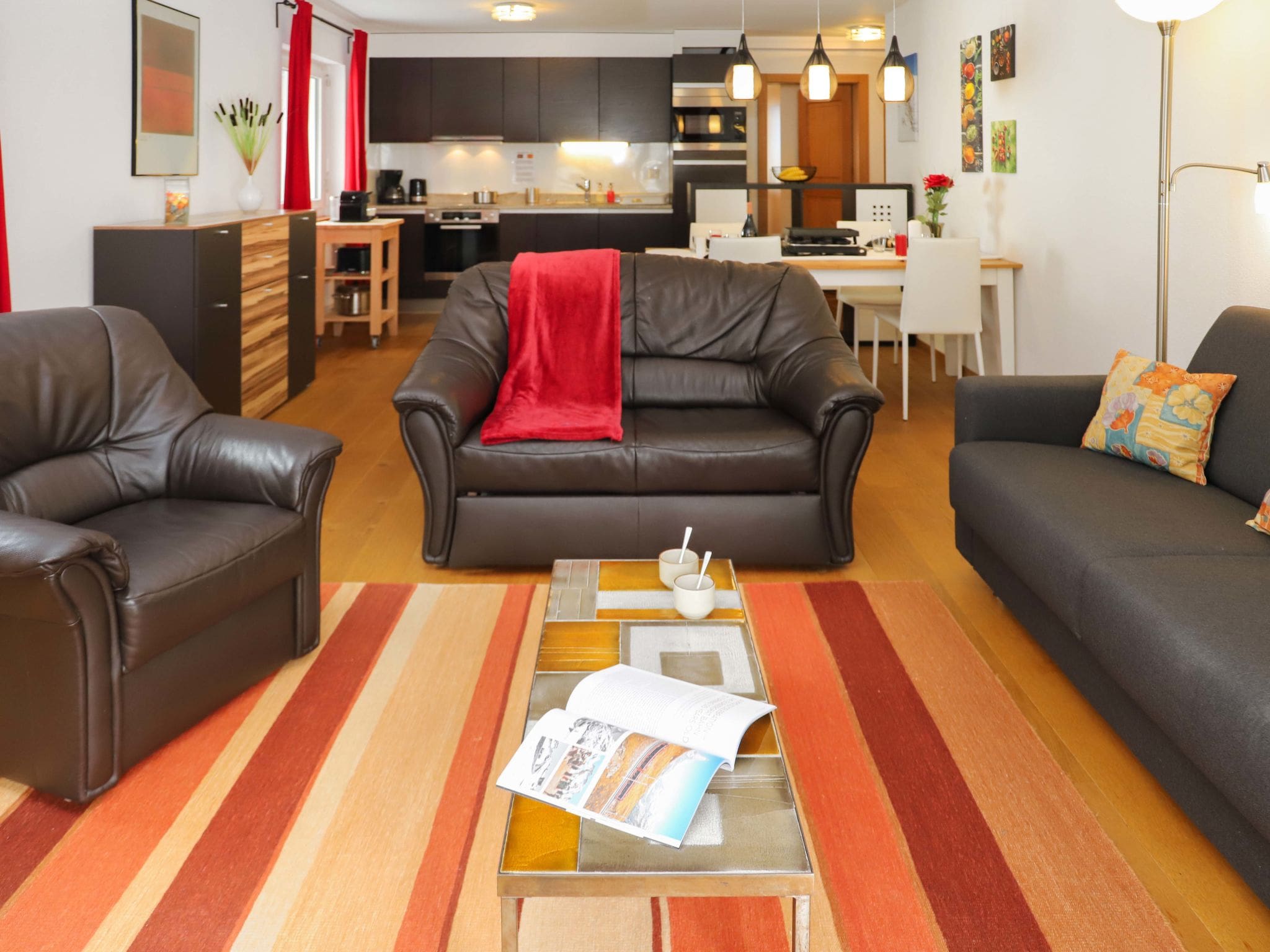 The property occupies the third floor of the elegant Siesta building, featuring 82 square metres of thoughtfully designed living space with a bright south-west orientation that maximizes natural light throughout the day. The open-plan living and dining area creates a welcoming atmosphere with comfortable furnishings, a television, hi-fi system, and DVD player for relaxing evenings after mountain adventures. The space flows seamlessly onto a private balcony where guests can enjoy breathtaking views of the iconic Matterhorn peak.