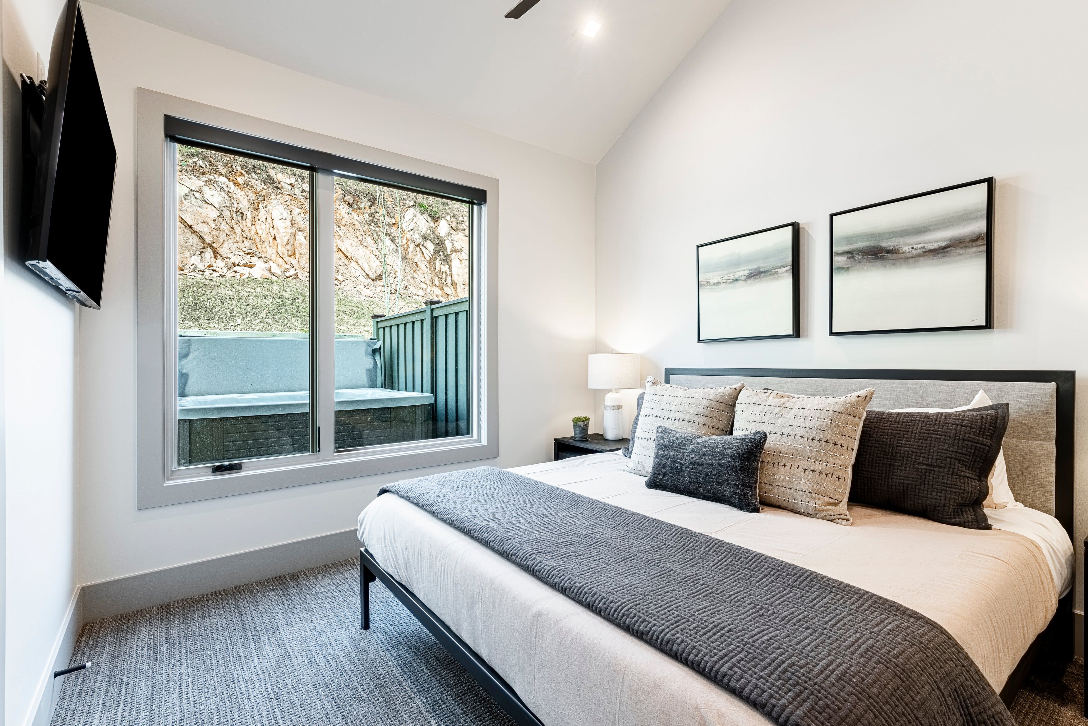 Step inside to discover a warm and inviting interior that seamlessly blends modern design with mountain-inspired elements. The spacious living area features a cozy fireplace, creating a perfect gathering spot for family and friends. A raised kitchen and dining area offer breathtaking views of the surrounding mountains, ideal for enjoying a meal with loved ones. Each bedroom is a sanctuary of comfort, with the primary suite occupying its own floor, complete with a private en-suite bathroom. A second bedroom features a queen bed and access to a private hot tub, perfect for unwinding after a day on the slopes.
