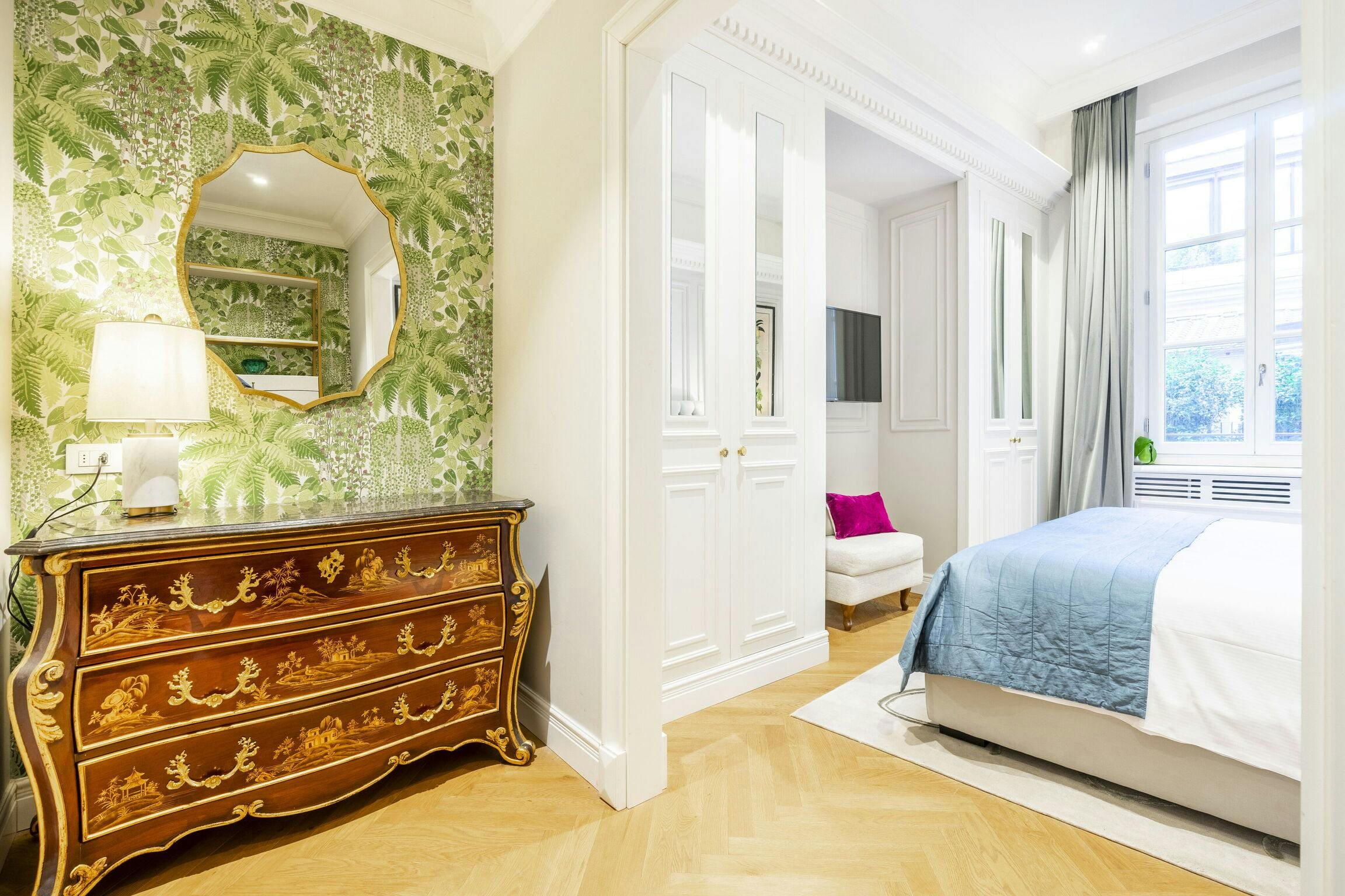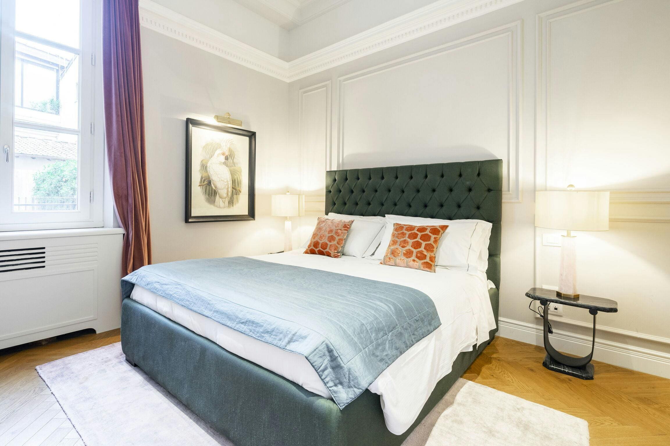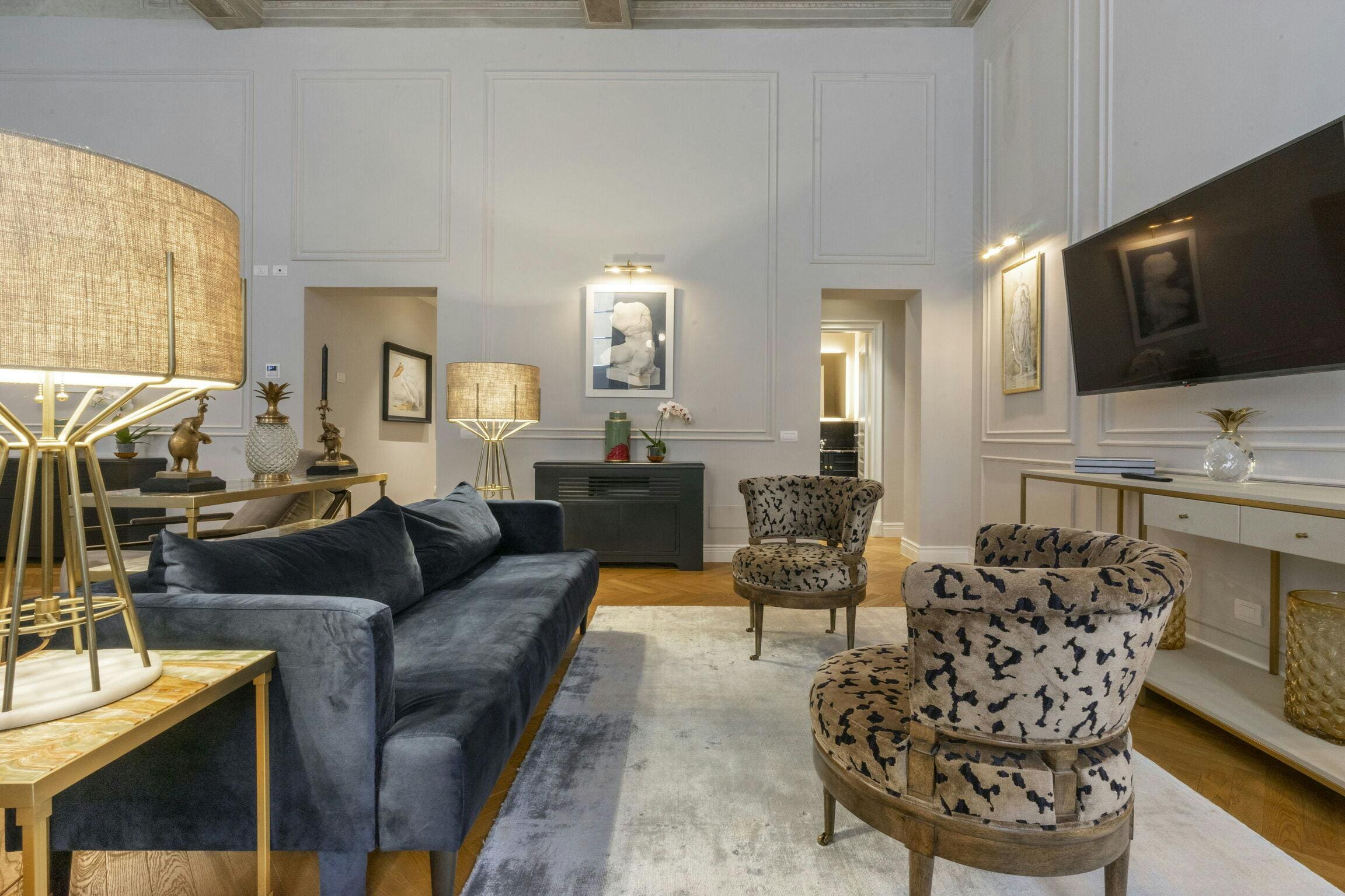 This apartment seamlessly blends historical charm with modern comforts. The spacious interiors boast original frescoes and meticulously restored details. Each of the four bedrooms features an en-suite bathroom, ensuring privacy and convenience for all guests. The living area is elegantly furnished, offering a welcoming space to relax, while the fully equipped kitchen invites culinary exploration.