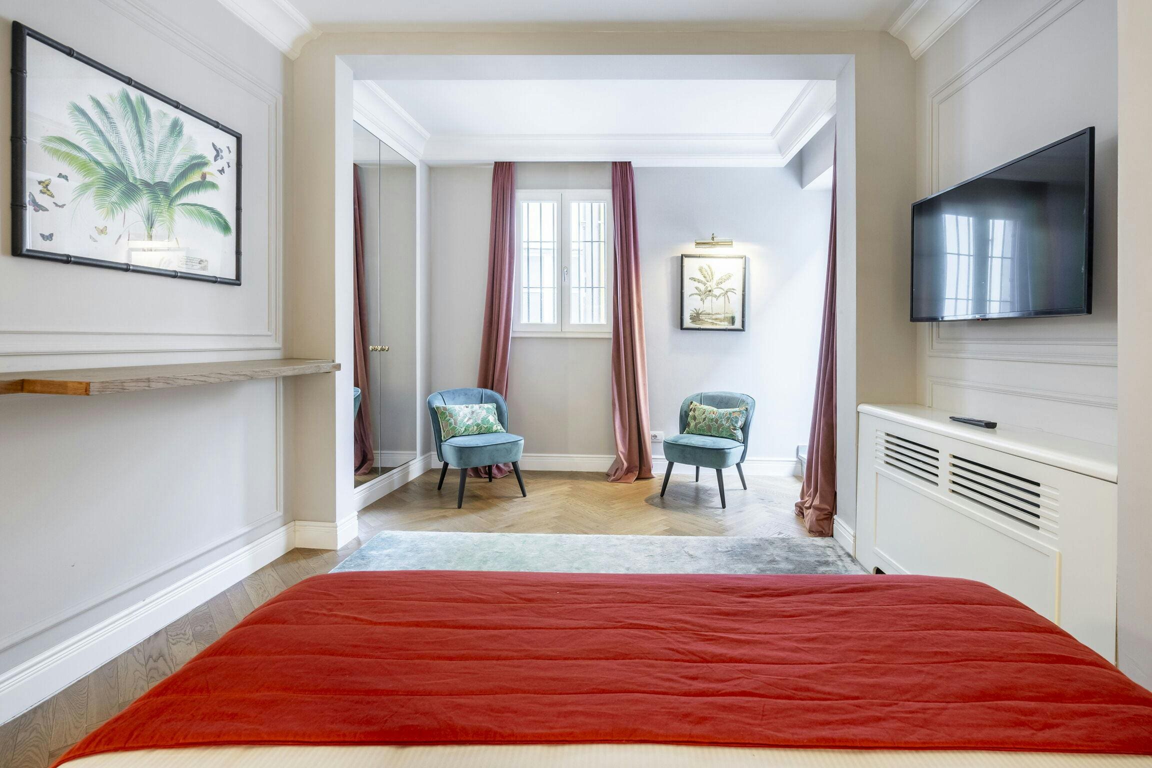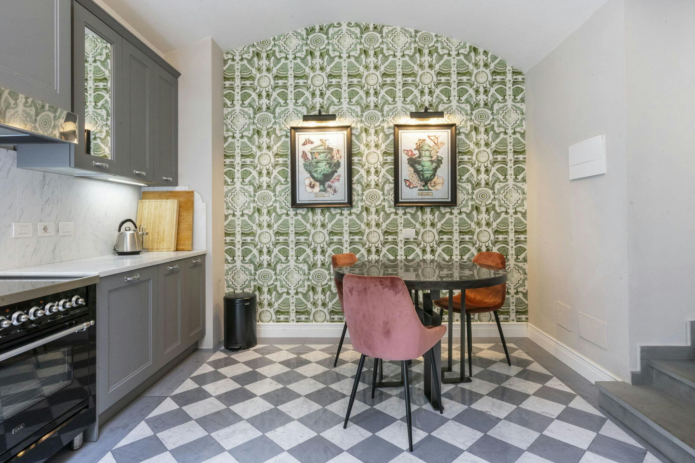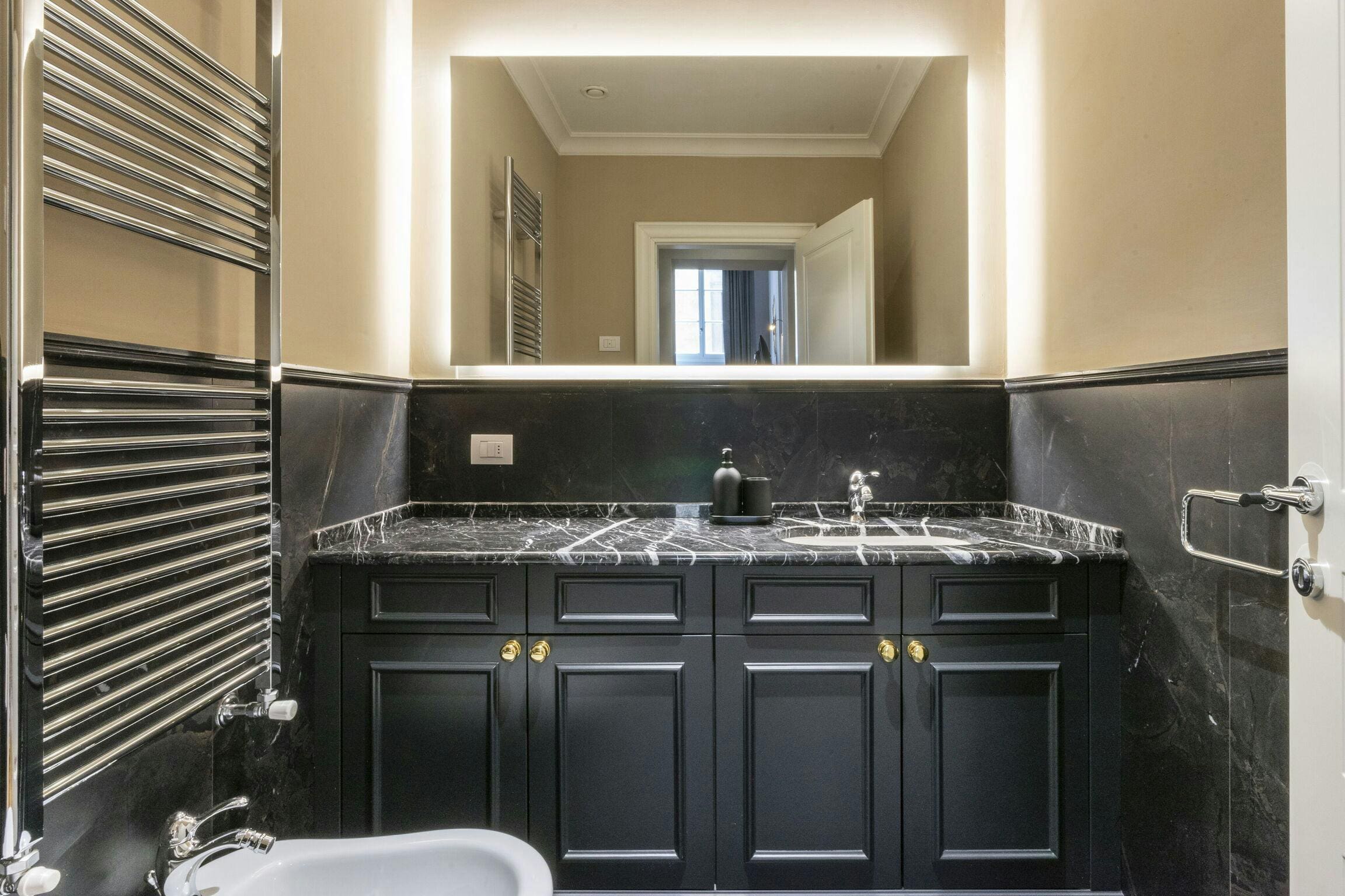 This apartment seamlessly blends historical charm with modern comforts. The spacious interiors boast original frescoes and meticulously restored details. Each of the four bedrooms features an en-suite bathroom, ensuring privacy and convenience for all guests. The living area is elegantly furnished, offering a welcoming space to relax, while the fully equipped kitchen invites culinary exploration.