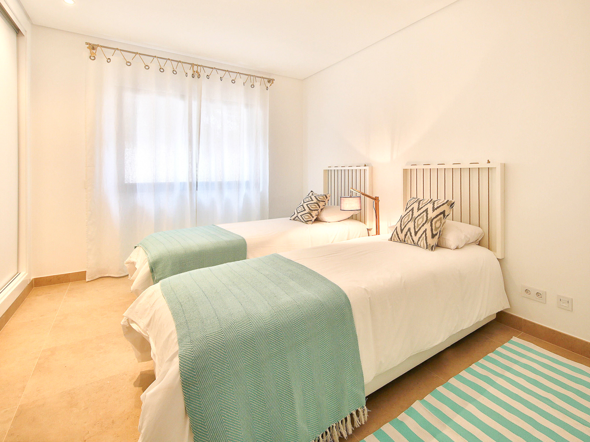 The 2 bedroom apartment is ideal for a small family of 4. The apartment is decorated in calming, neutral colours and has its own private outdoor space for alfresco dining and a small pool.