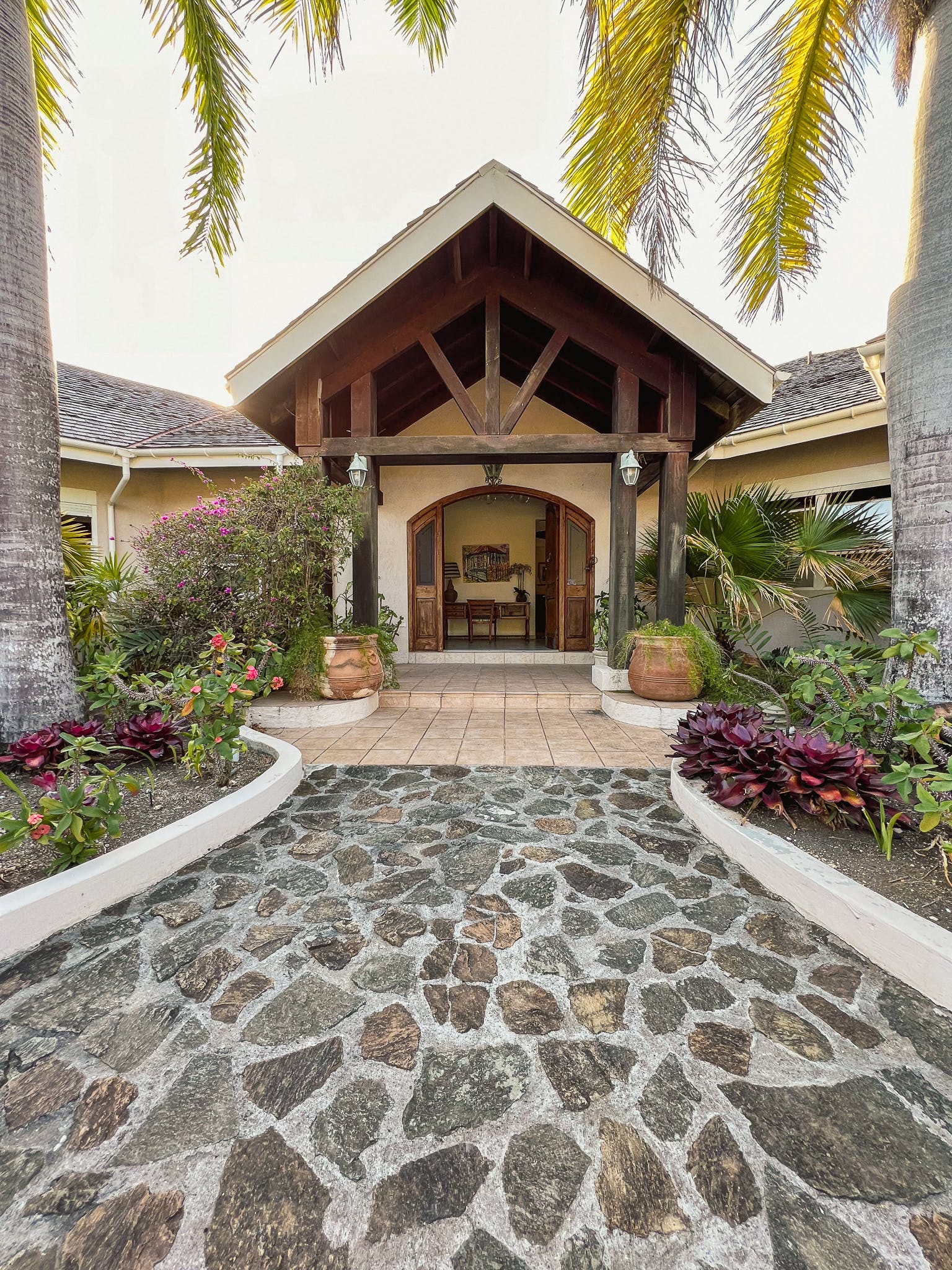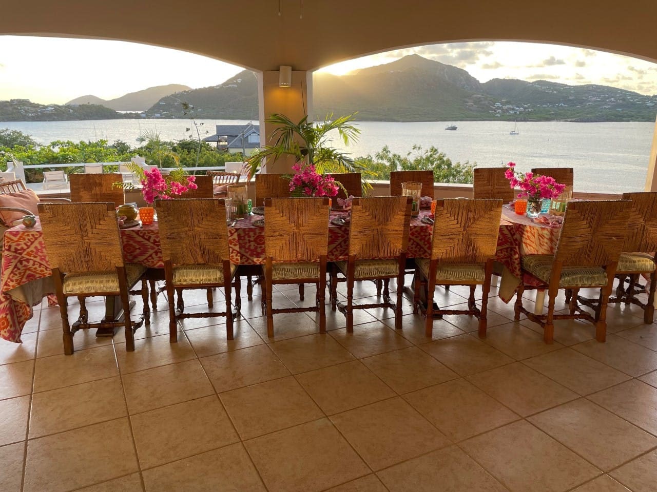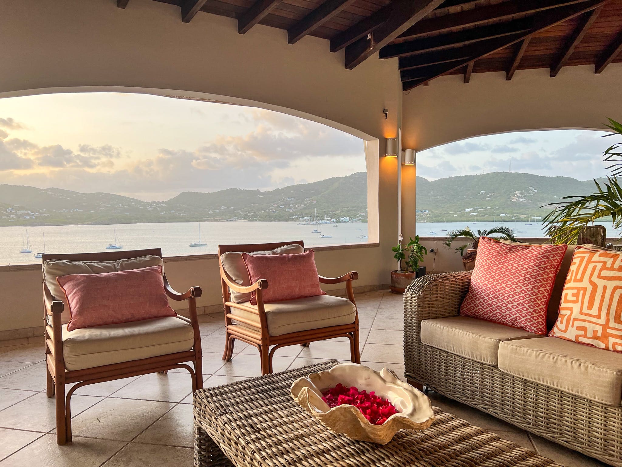 The interior of this 6-bedroom, 6-bathroom villa is a harmonious blend of Caribbean charm and modern elegance. With air-conditioned bedrooms designed to ensure comfort in the tropical climate, guests can unwind in style. The living room features a lofty wooden ceiling and characterful touches like an antique writer’s bureau, making it a perfect retreat. A fully-equipped kitchen invites culinary creativity, with the option to have a private chef prepare meals to be savored on the terrace overlooking the bay.