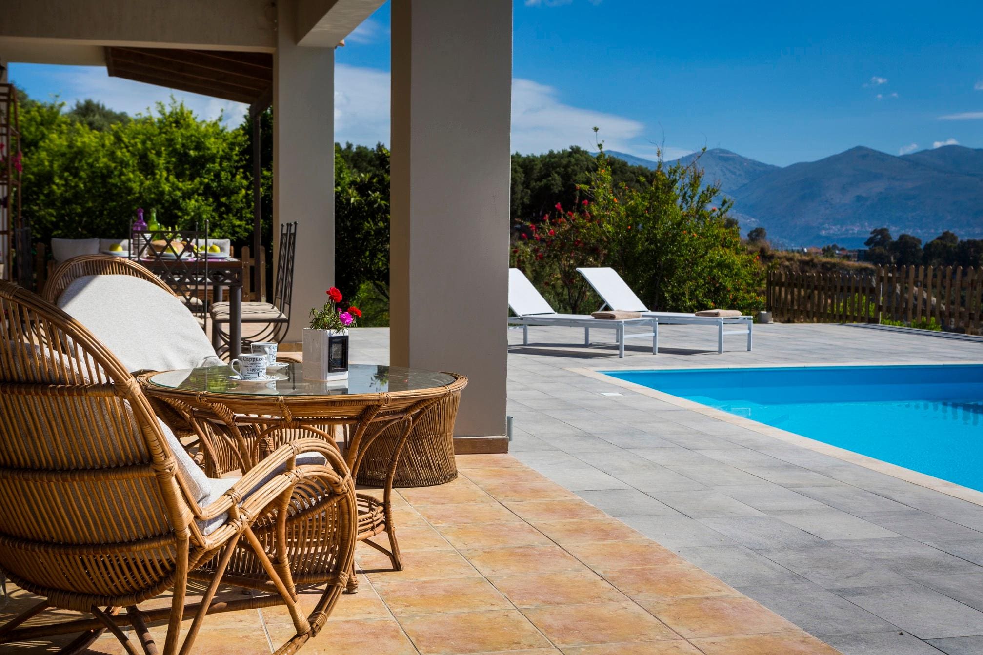 Outside, the property boasts a stunning swimming pool where you can unwind while taking in the panoramic views of the Ionian Sea. The terrace is perfect for alfresco dining, complete with a BBQ setup. The surrounding cliffs and mountains provide a dramatic backdrop, enhancing the serene ambiance of this luxurious haven.
