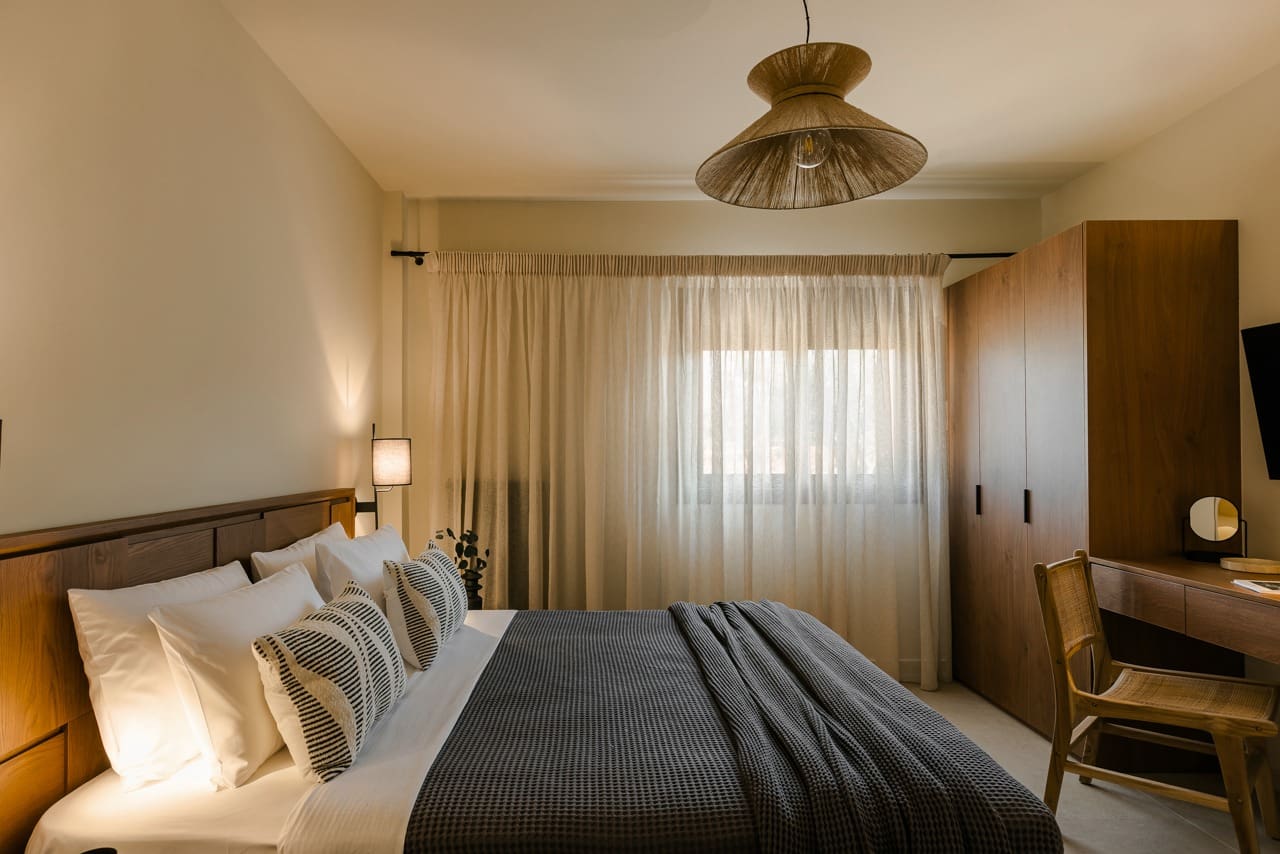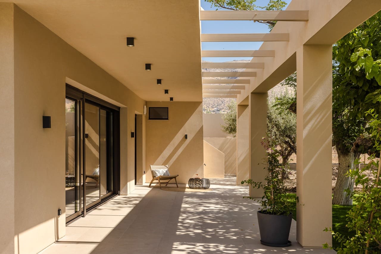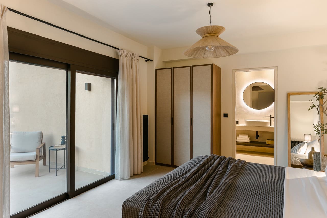 Step outside to find a private swimming pool surrounded by lush greenery, the perfect spot for sunbathing or a refreshing dip. The apartment’s terraces provide idyllic spaces for outdoor dining, where you can savor local delicacies while enjoying views of the surrounding vineyards and olive groves. The gentle Meltemi breezes add a touch of local charm to your outdoor experience.