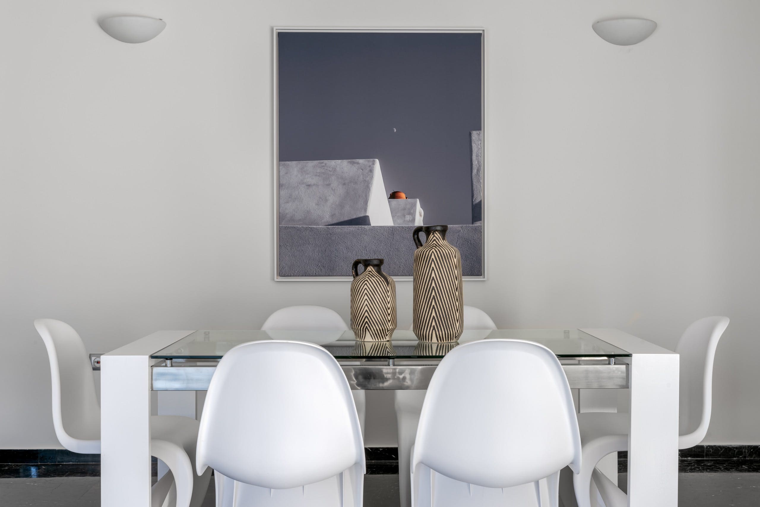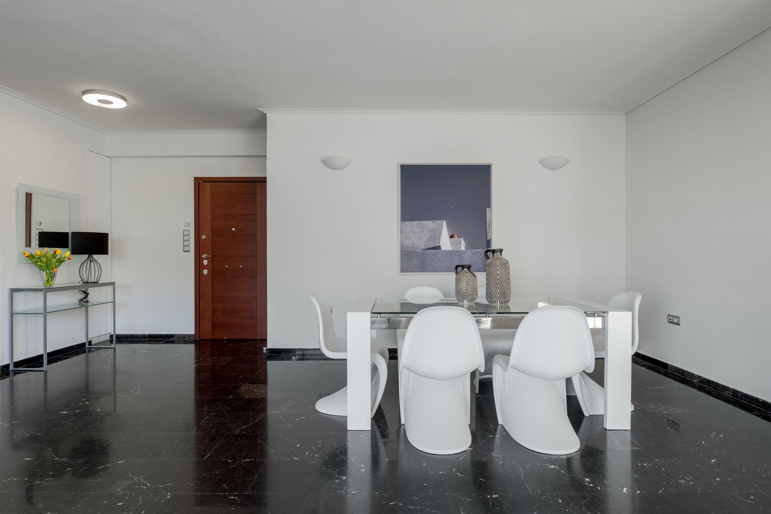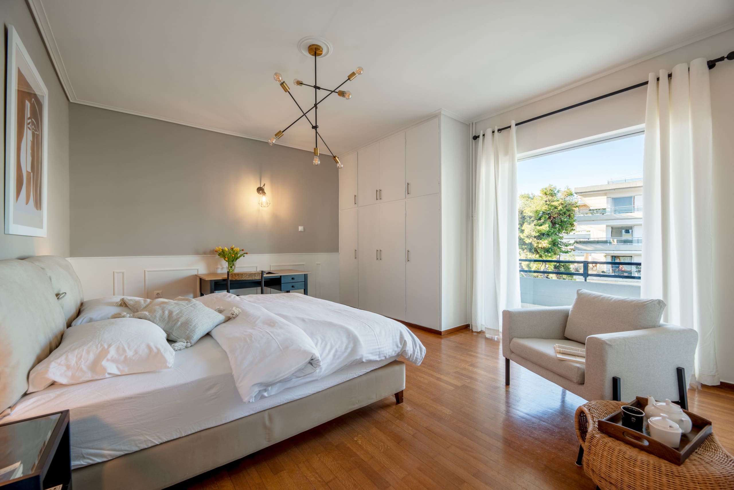 The apartment’s expansive balcony wraps around the entire property, providing ample space for outdoor dining and relaxation. From here, guests can soak in the panoramic views of the Aegean Sea and enjoy the gentle sea breeze. The proximity to Glyfada Beach ensures that sun and sand are always just a short walk away, enhancing the allure of this exceptional rental.